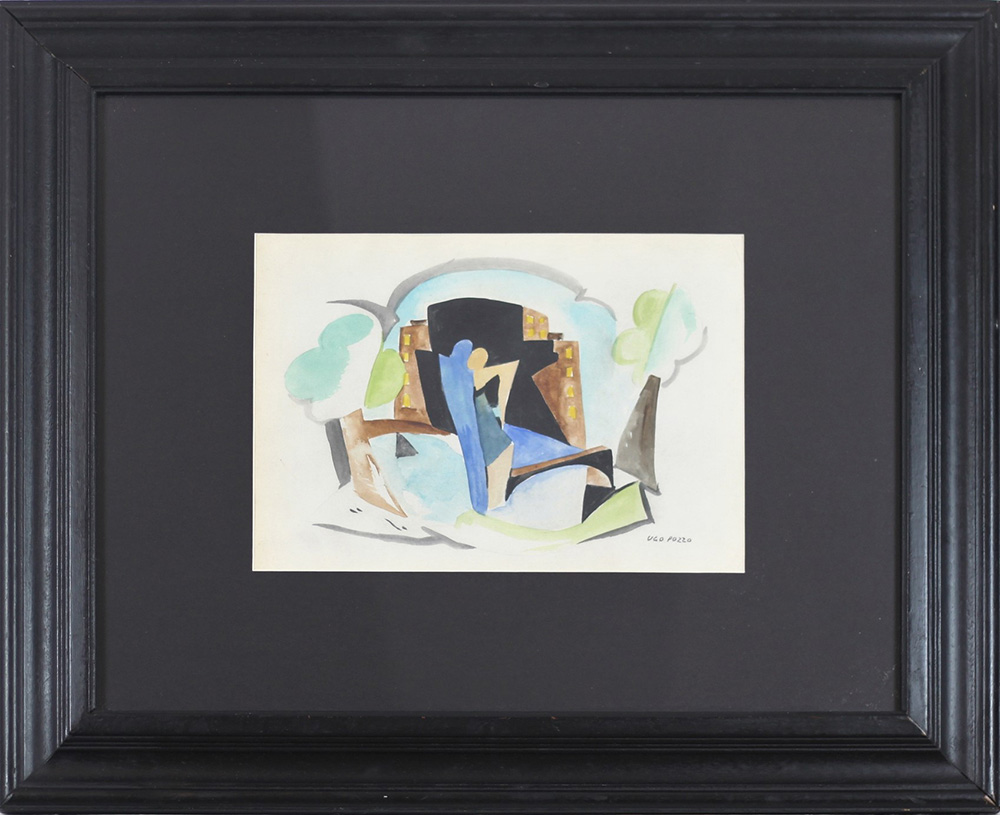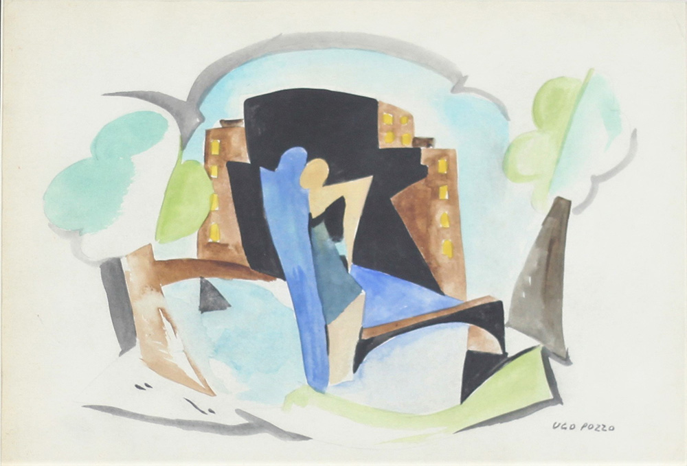 UGO POZZO, Composizione futurista, Tempera diluita su carta Anni 30 Dim. 21x30 Al verso data, titolo e firma Firmato in basso a dx