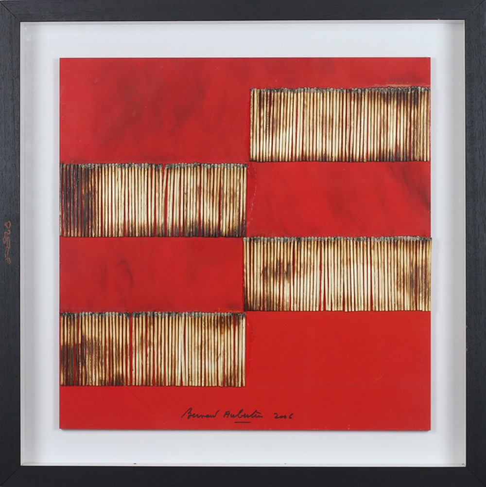 Lotto 141 | BERNARD AUBERTIN, Dessin de feu sur table rouge, Fiammiferi bruciati su...