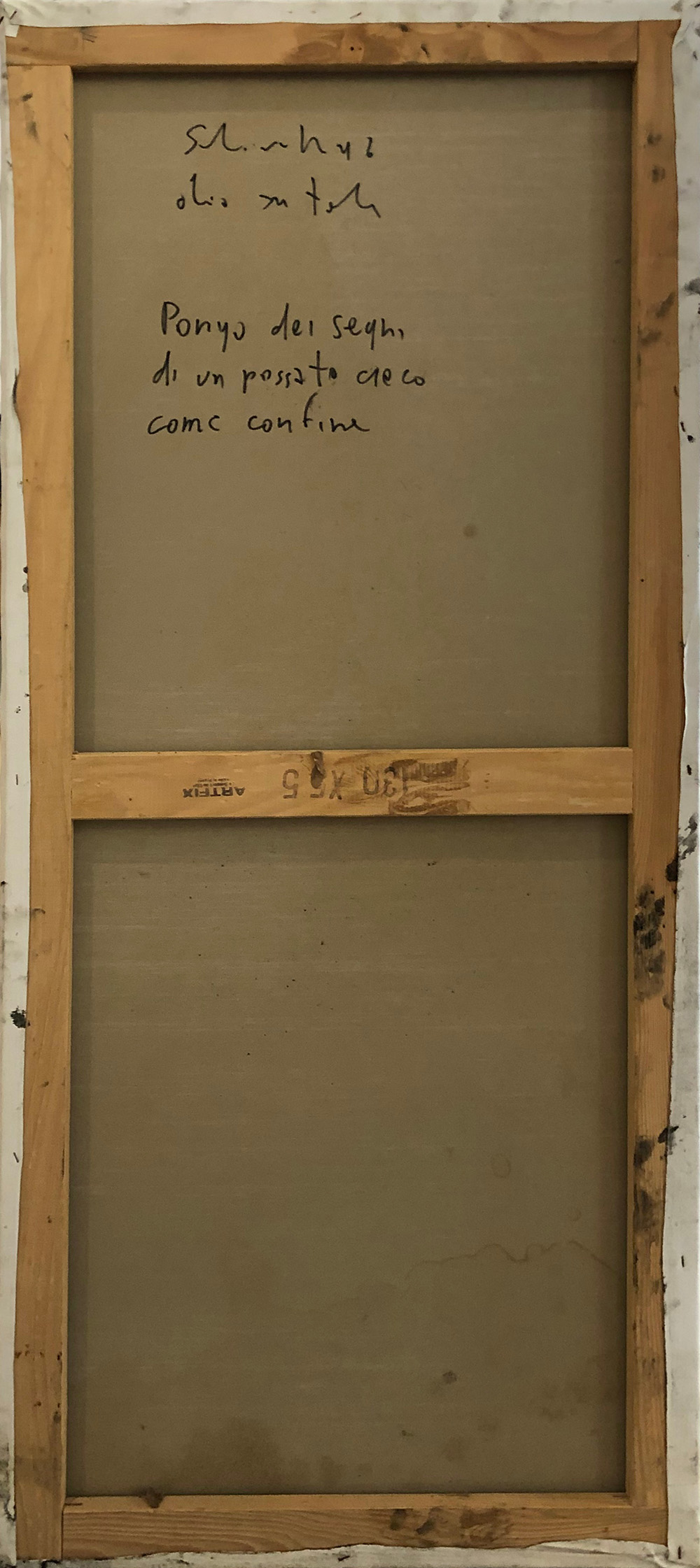BEPPE SCHIAVETTA, Pongo dei segni di un passato greco come confine, Olio su tela Dim. 130x55 Al verso tecnica, titolo e firma