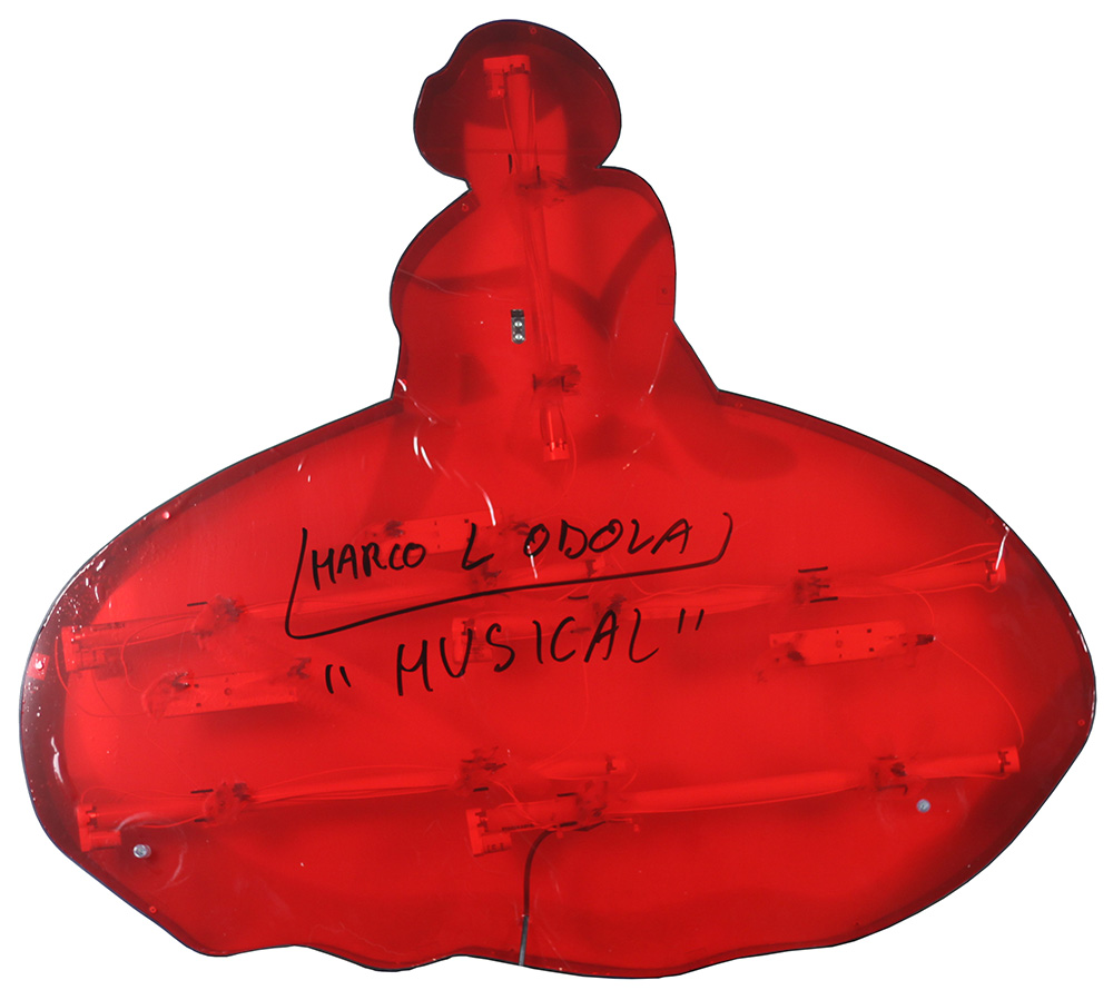 MARCO LODOLA, Musical, Scultura luminosa plexiglass e neon Anni 2000 Dim. 105x118x12 Autentica su foto dell’artista Al verso titolo e firma