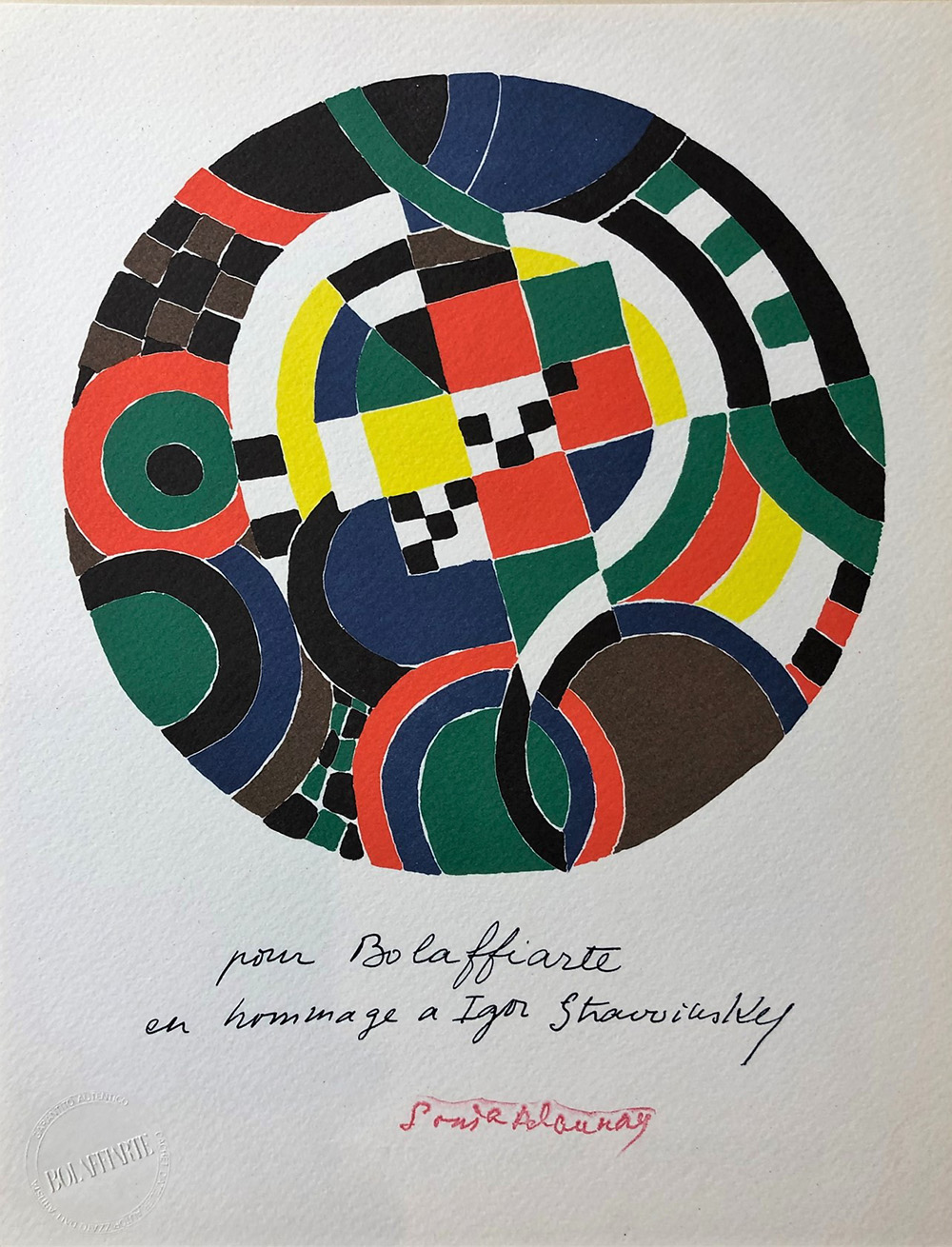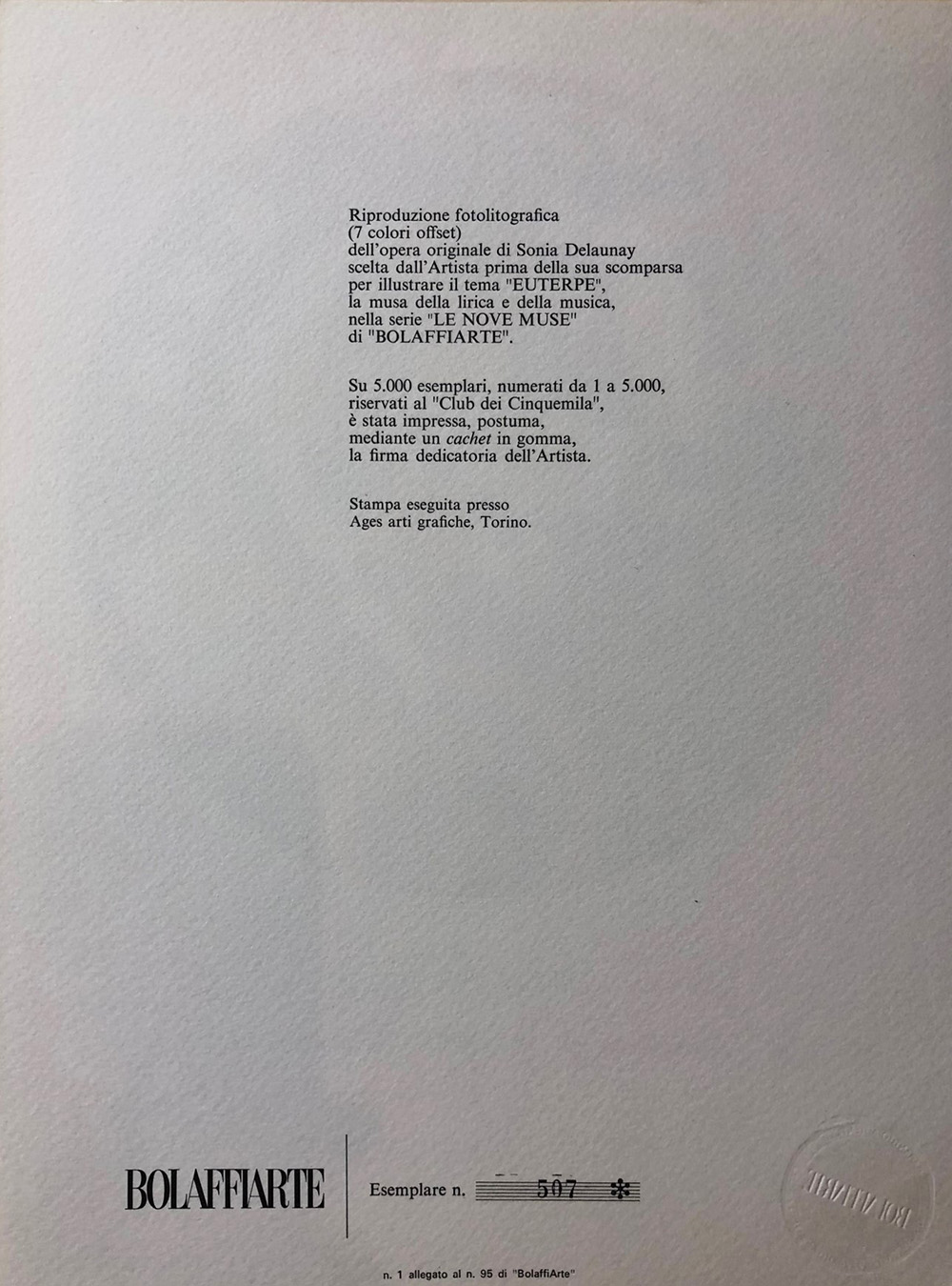 SONIA DELAUNAY TERK, Euterpe, Riproduzione fotolitografica (7 colori offset) dell’opera originale di Sonia Delaunay scelta dall’artista prima della sua scomparsa per illustrare il tema "Euterpe" la musa della lirica e della musica, nella serie "Le nove muse" di Bolaffi Arte. Dim. 28x21 Opera senza cornice Esemplare 507/5000 Timbro a secco Bolaffi Arte in basso a sx Firma in basso al centro