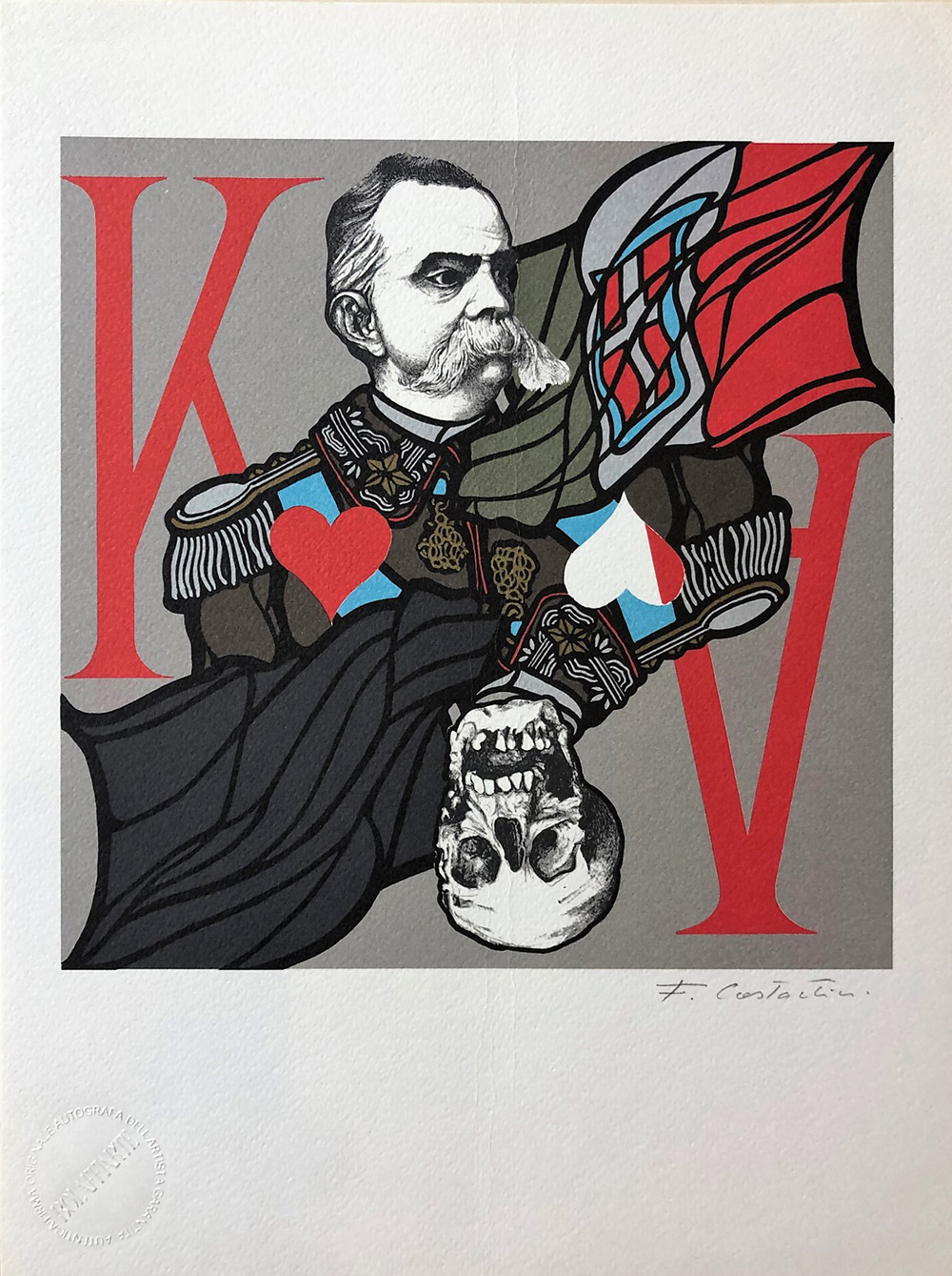 FLAVIO COSTANTINI, Il Re, Riproduzione fotolitografica a 9 colori espressamente eseguita per la collezione "Le carte da gioco" di Bolaffi Arte. Dim. 28x21 Opera senza cornice Esemplare 1413/5000 Timbro a secco Bolaffi Arte in basso a sx Firma in basso a dx