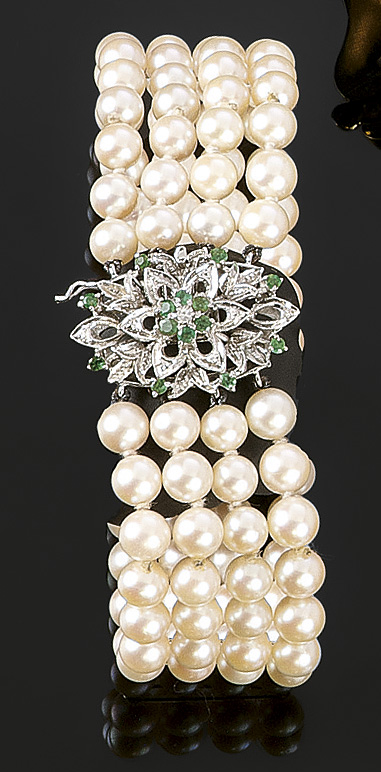 BRACCIALE Bracciale composto da quattro fili di perle da mm. 6,3 a mm 6,4 distanziali e chiusura in oro bianco, quest'ultima con piccoli smeraldi taglio rotondo Lungh. cm. 22