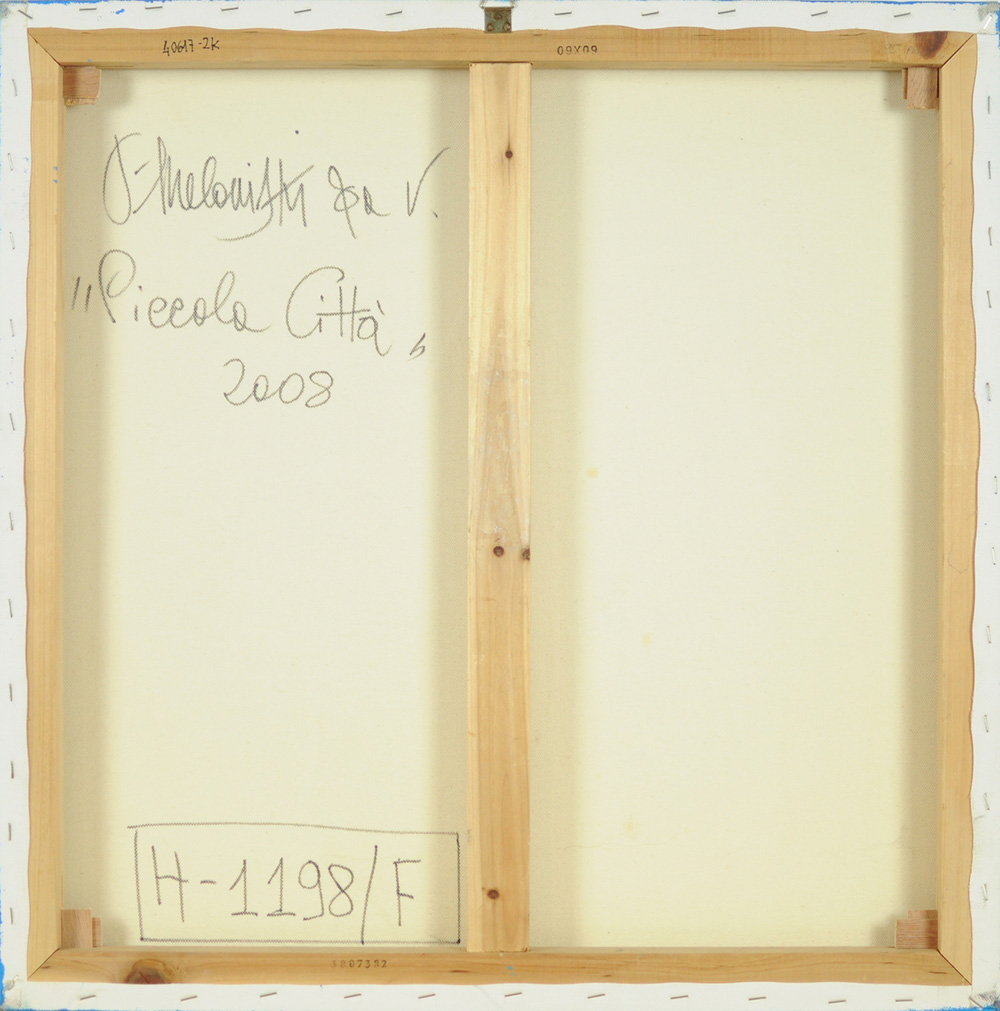 MELONISKI, Piccola città, Polimaterico e collage su tela Anno 2008 Dim. 60x60 Opera senza cornice Autentica su foto dell'artista Opera archiviata al N.40617/2K presso Galleria prospettive d'Arte (MI) Opera archiviata al N.H-1198/F presso Archivio delle Opere di Meloniski Al verso archivio, data, titolo e firma Datato e firmato in basso a sx
