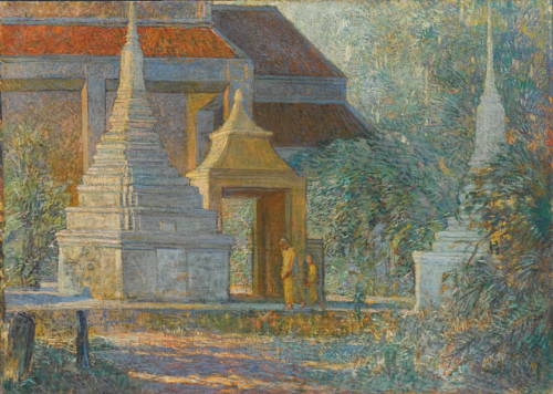 GALILEO CHINI 1873-1956 VECCHIO CIMITERO DI SAM PHAYA oil on canvas. Executed in 1913 firmato olio su tela cm 118x165 Eseguito nel 1913 PROVENANCE Galleria del Levante, Milano Ivi acquistato dall'attuale proprietario EXHIBITED Venezia, XI Esposizione Internazionale d'Arte, 1914, n. 8, pag. 89 Lido di Camaiore, Villa Chini, Galileo Chini, 1964, fig. 43, pag. 78 (intitolato Giardino nel monastero siamese) Arezzo, Galleria Comunale d'Arte Contemporanea Sala Sant'Ignazio, Galileo Chini, 1968, illustrato (intitolato Tempio siamese e datato 1912) Firenze, Galleria Il Fiorino, Galileo Chini, 1972, fig. 28 (intitolato Giardino nel monastero siamese) Massa, Castello Malaspina, Galileo Chini. Mostra retrospettiva nel centenario della nascita, 1973, n. 15 (intitolato Giardino nel monastero siamese) Roma, Galleria Nazionale d'Arte Moderna, Galileo Chini. Dipinti, decorazione, ceramica, teatro, illustrazione, 2006, pag. 115, n. 2.37, illustrato a colori Ravenna, MAR Museo d'Arte della città di Ravenna, L'artista viaggiatore da Gaugin a Klee da Matisse a Ontani, 2009 Reggio Emilia, Fondazione Palazzo Magnani, Incanti di terre lontane. Hayez, Fontanesi e la pittura italiana tra Otto e Novecento, 2012 LETTERATURA T. Fiori, Archivi del Divisionismo, Roma 1968, pag. 205, fig. 2558, XXI.21, (intitolato Tempio siamese o Giardino nel monastero siamese)