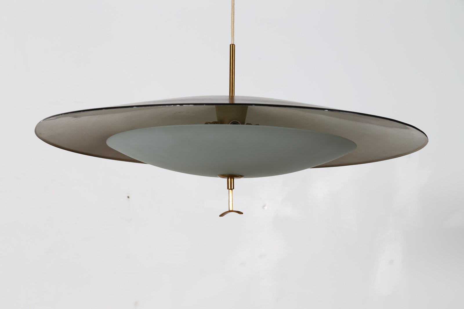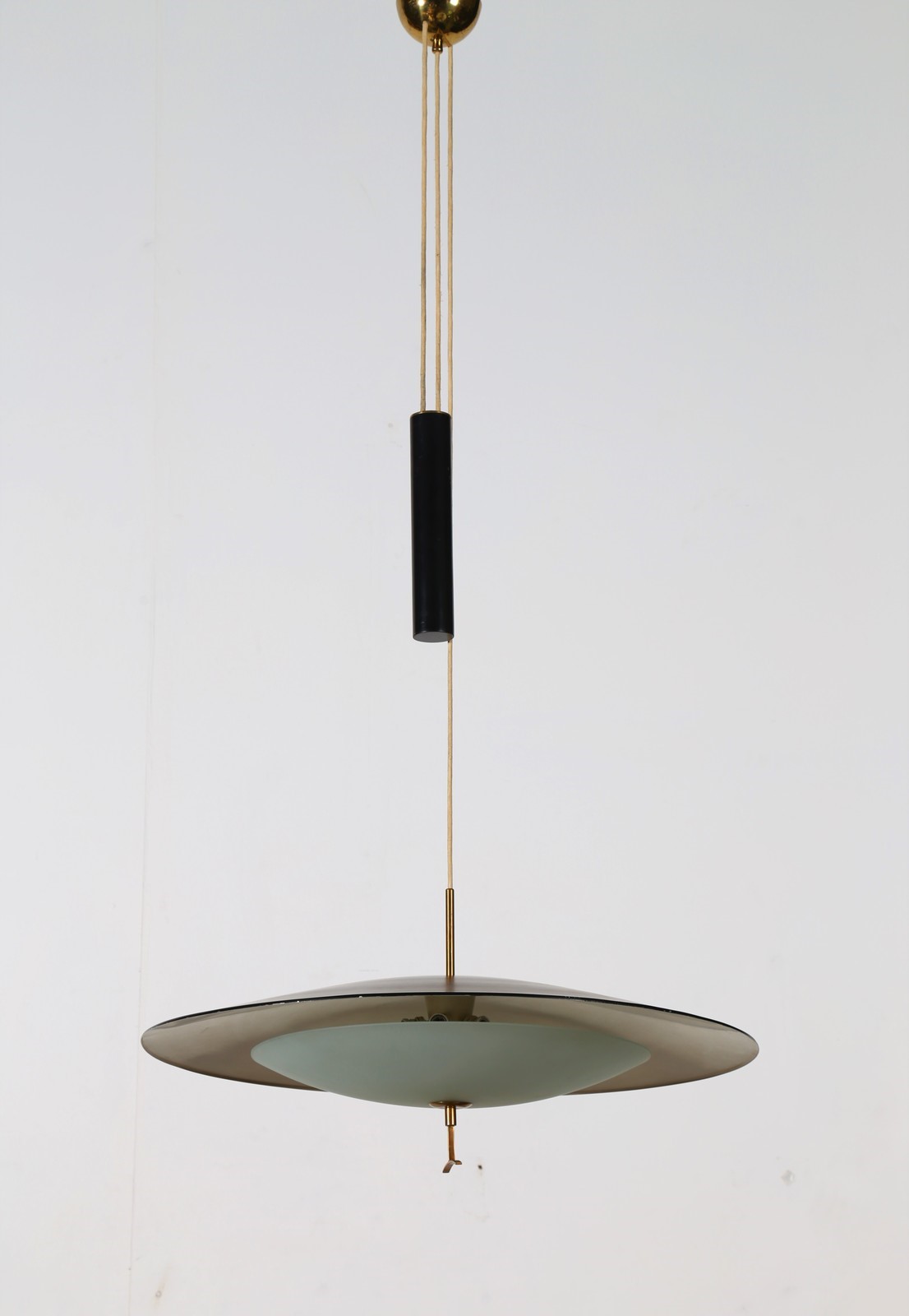 FONTANA ARTE Lampadario saliscendi anni 50. -. Cm 72,00 x 200,00 x 72,00. Metallo laccato, ottone e vetro satinato