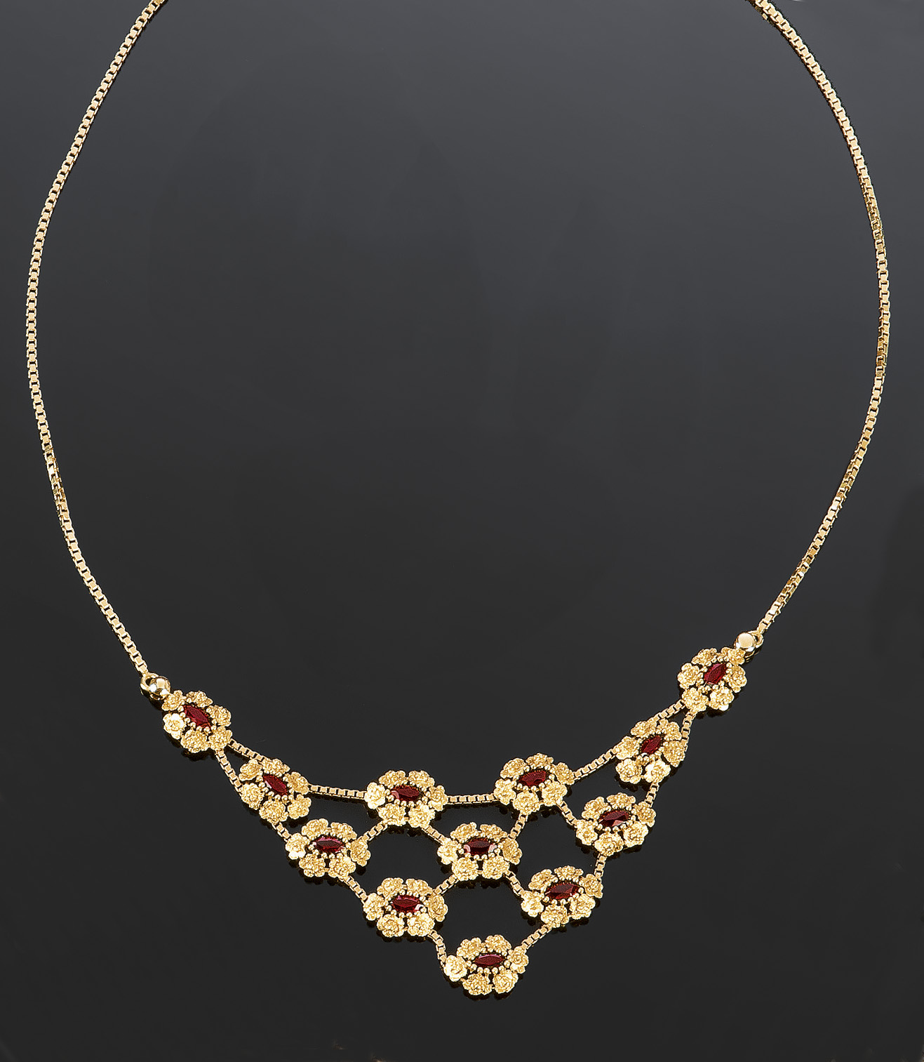 COLLIER Collier in oro giallo lucido e satinato, composto da dodici fiori trattenenti al centro granati taglio a goccia Peso gr. 22,9