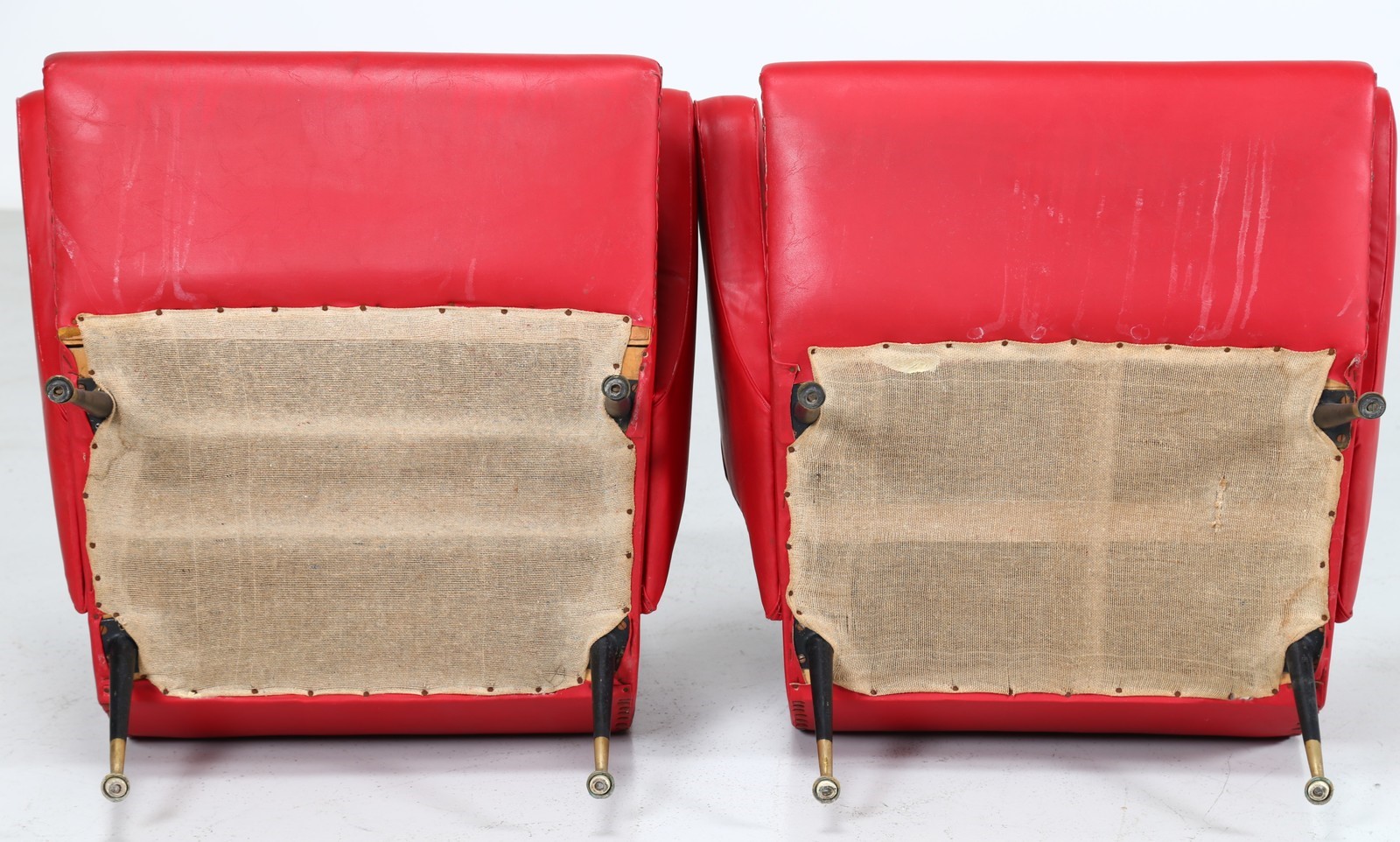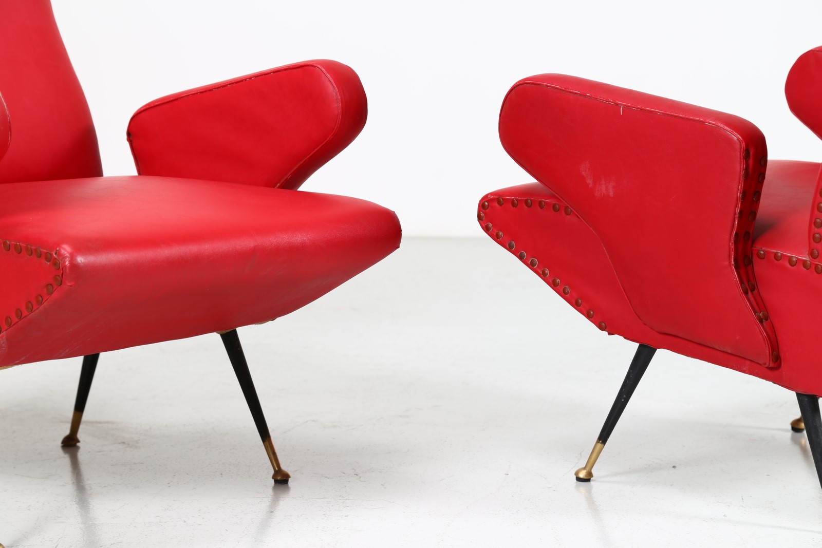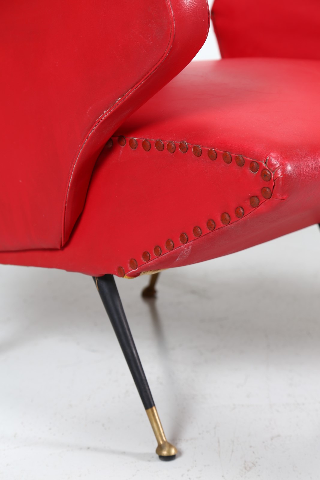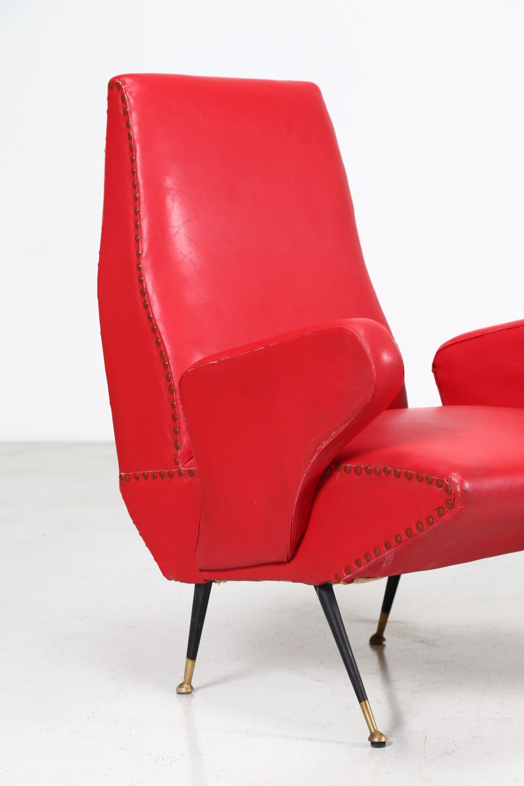 MANIFATTURA ITALIANA Coppia di poltrone rosse, anni 60. -. Cm 63,00 x 87,00 x 70,00. Metallo laccato, ottone e skai