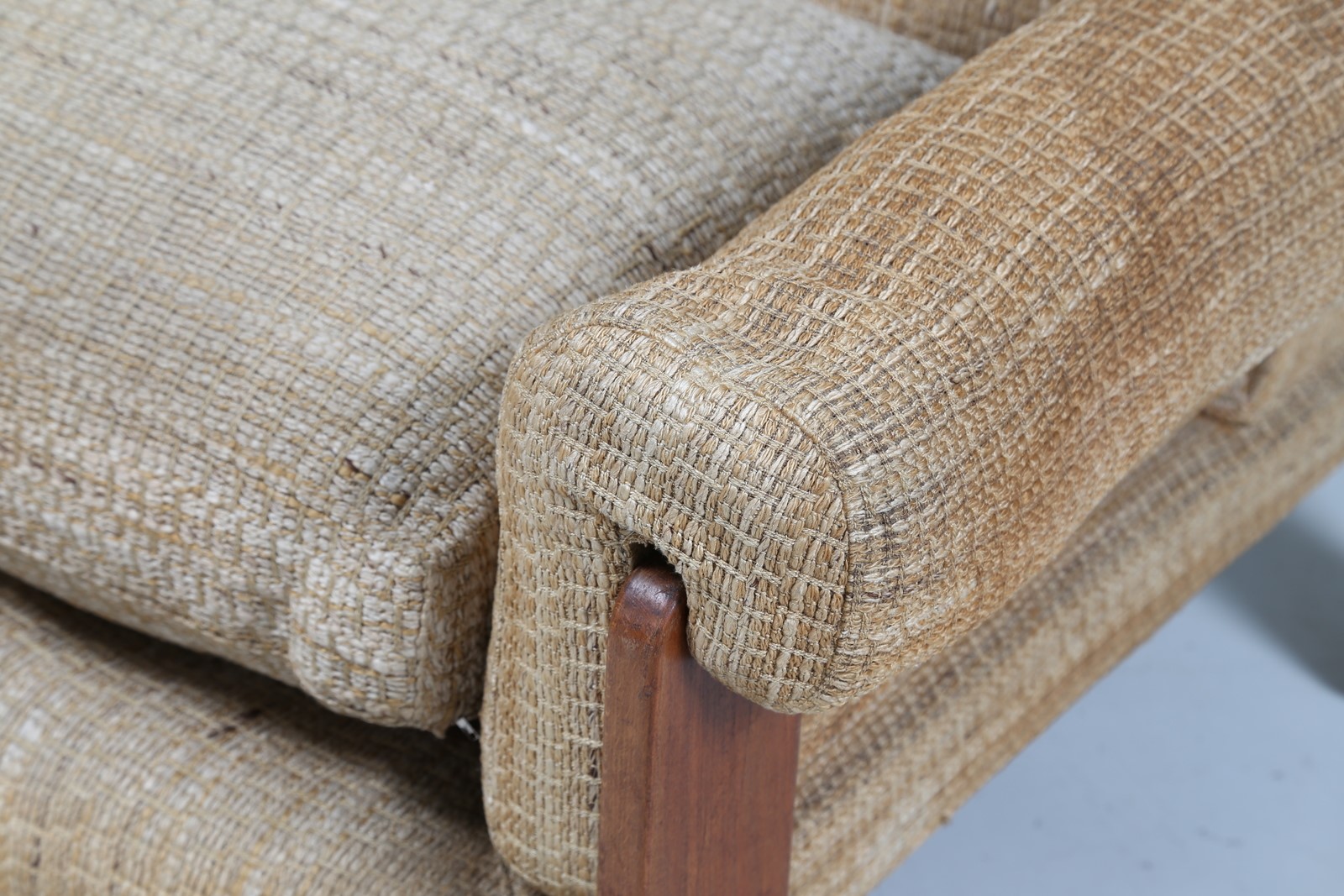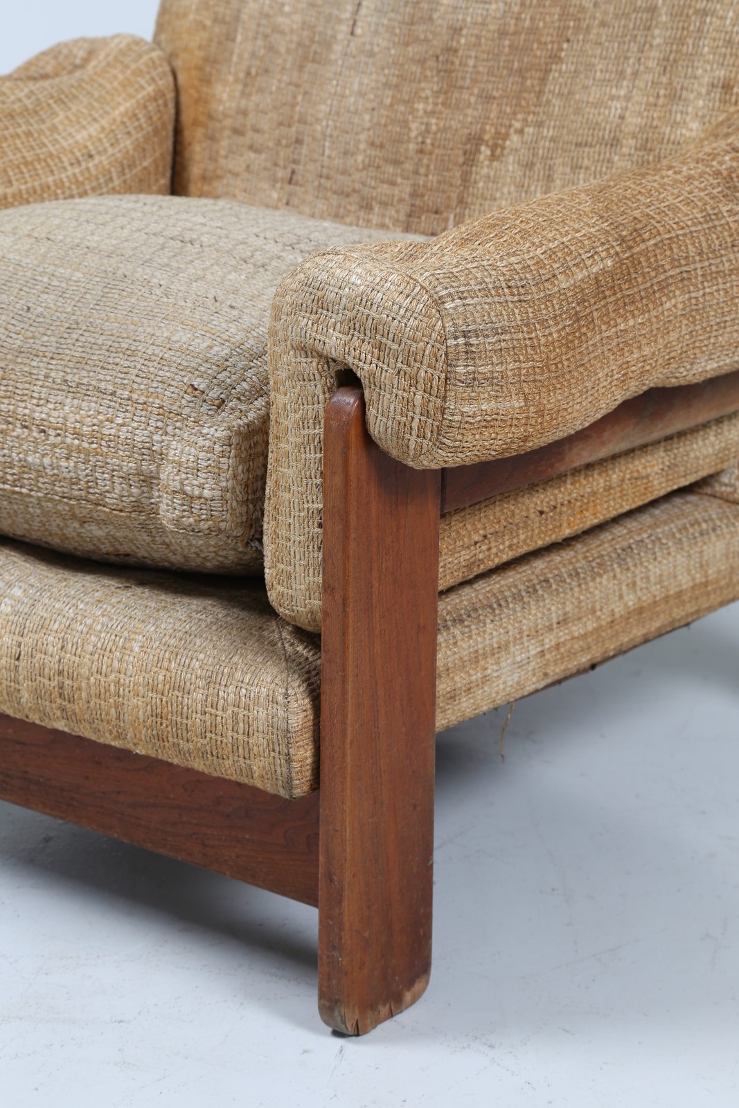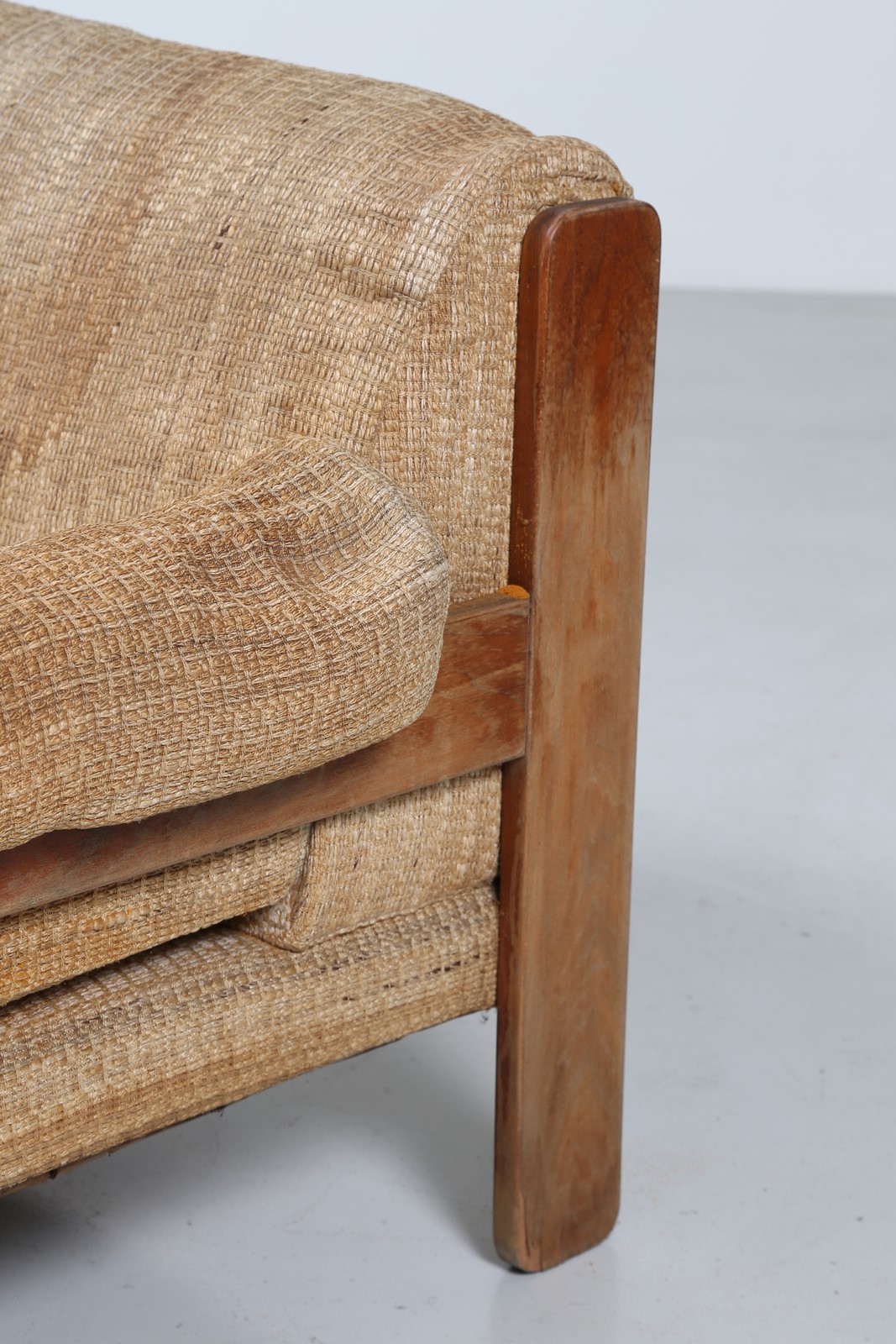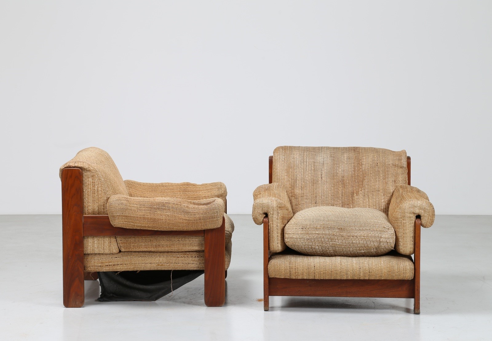 SAPORITI SERGIO Coppia poltrone in legno e tessuto originale, per F.lli Saporiti anni 70. Etichetta presente. . -. Cm 95,00 x 80,00 x 88,00.