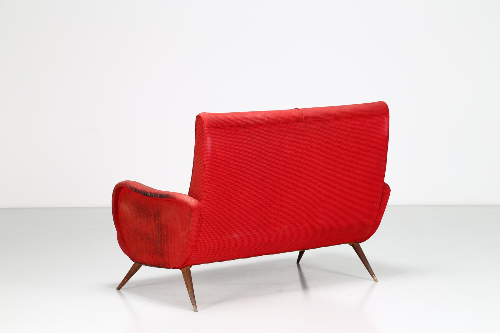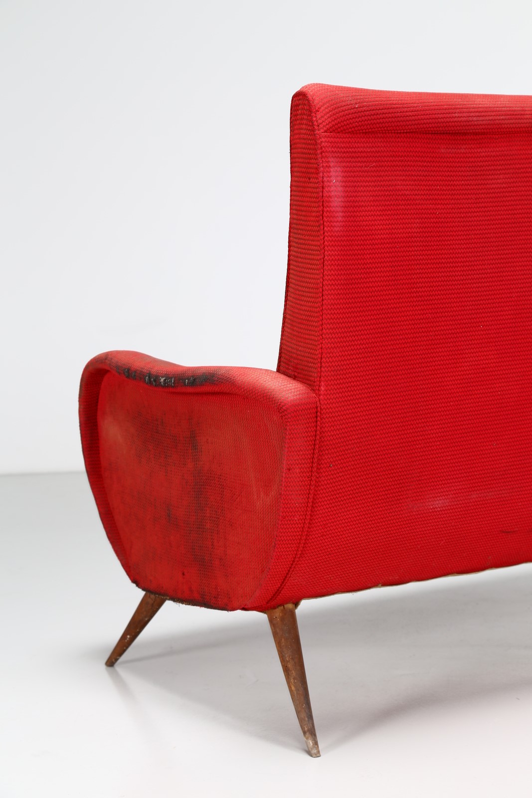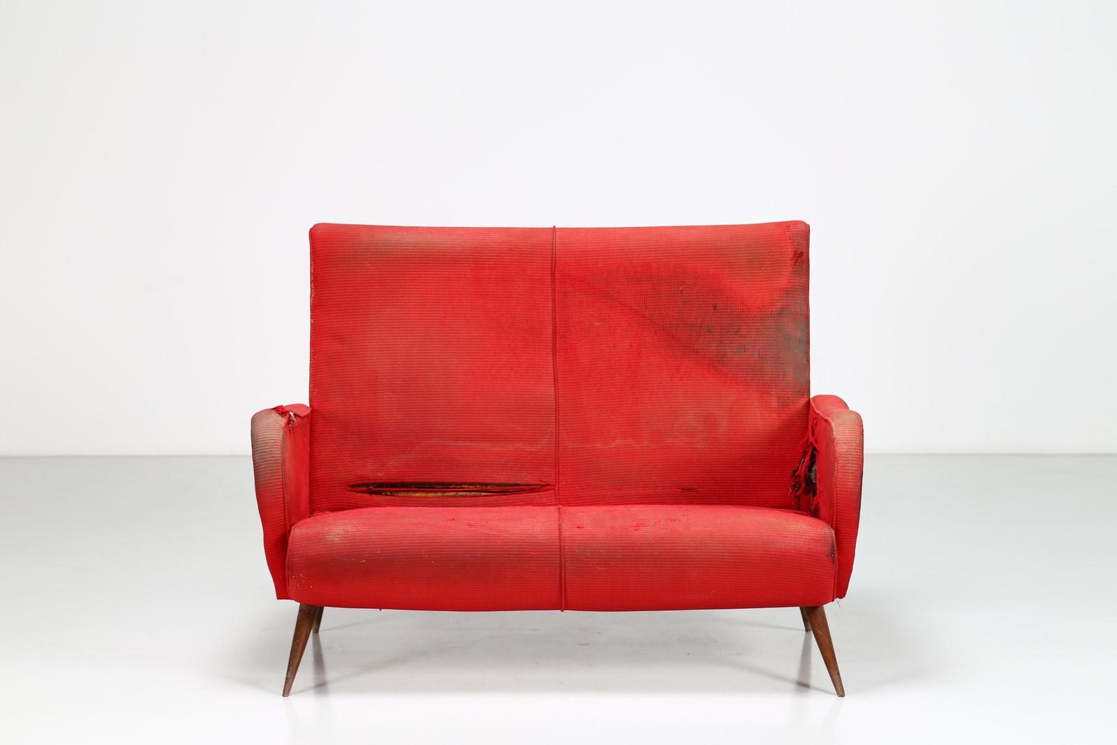 MANIFATTURA ITALIANA Divano due posti in legno e tessuto, anni 50. -. Cm 125,00 x 92,00 x 75,00.