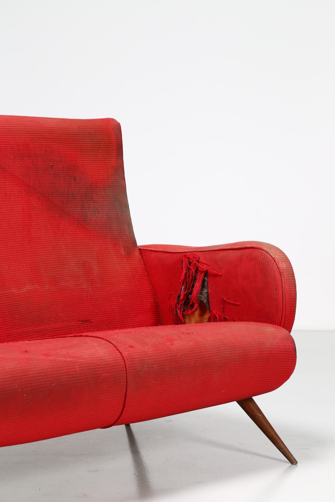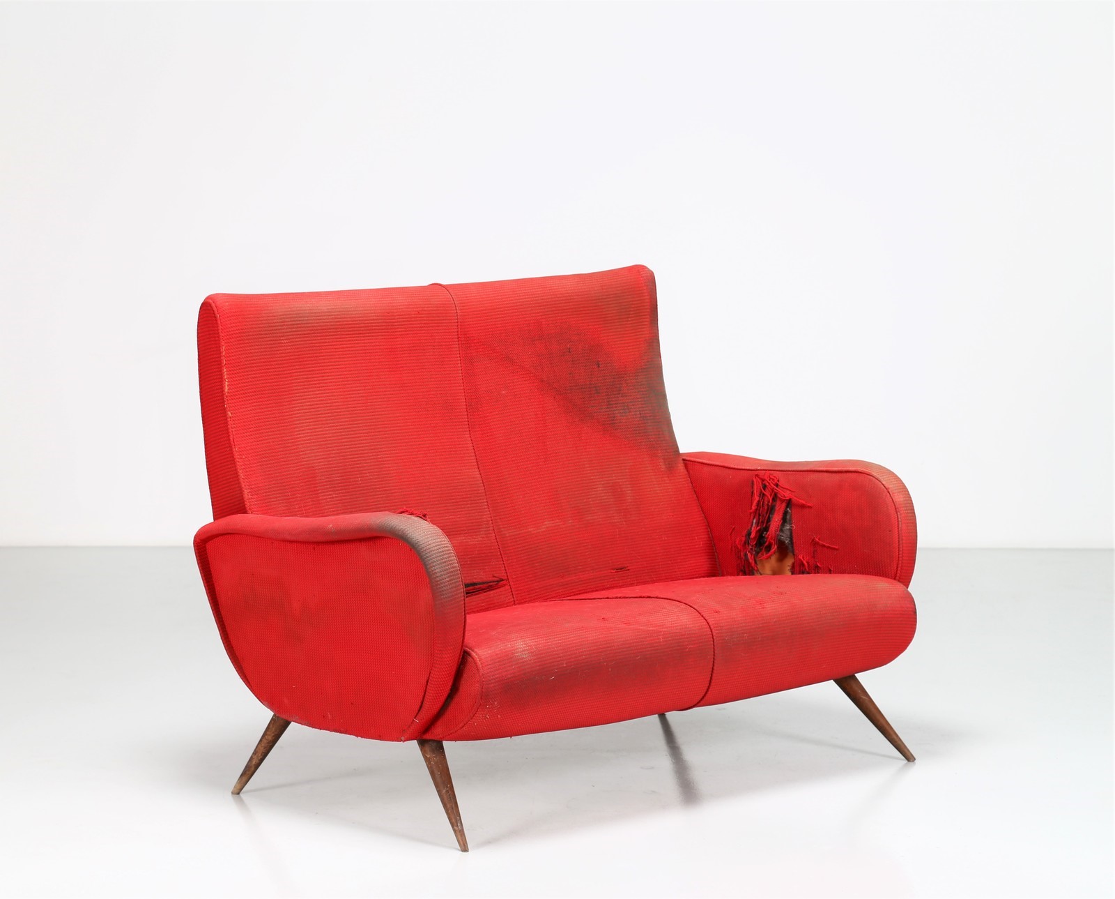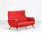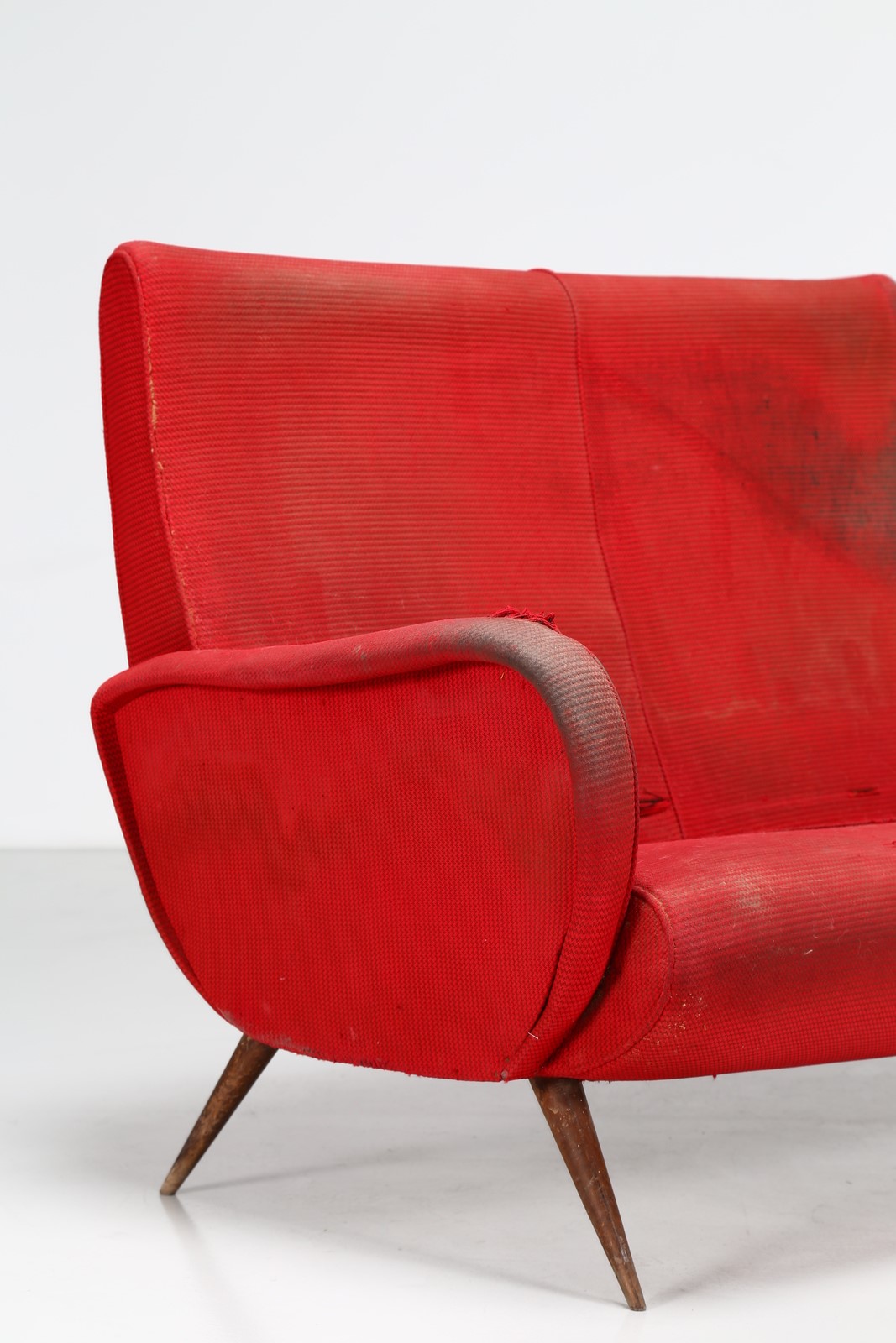 MANIFATTURA ITALIANA Divano due posti in legno e tessuto, anni 50. -. Cm 125,00 x 92,00 x 75,00.