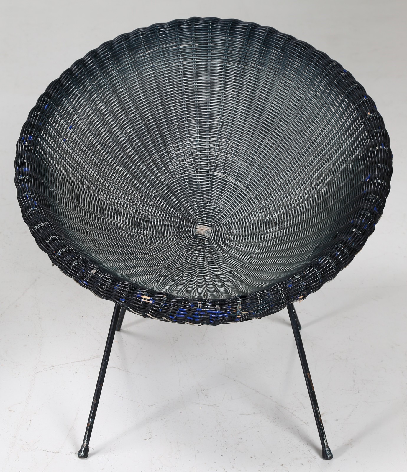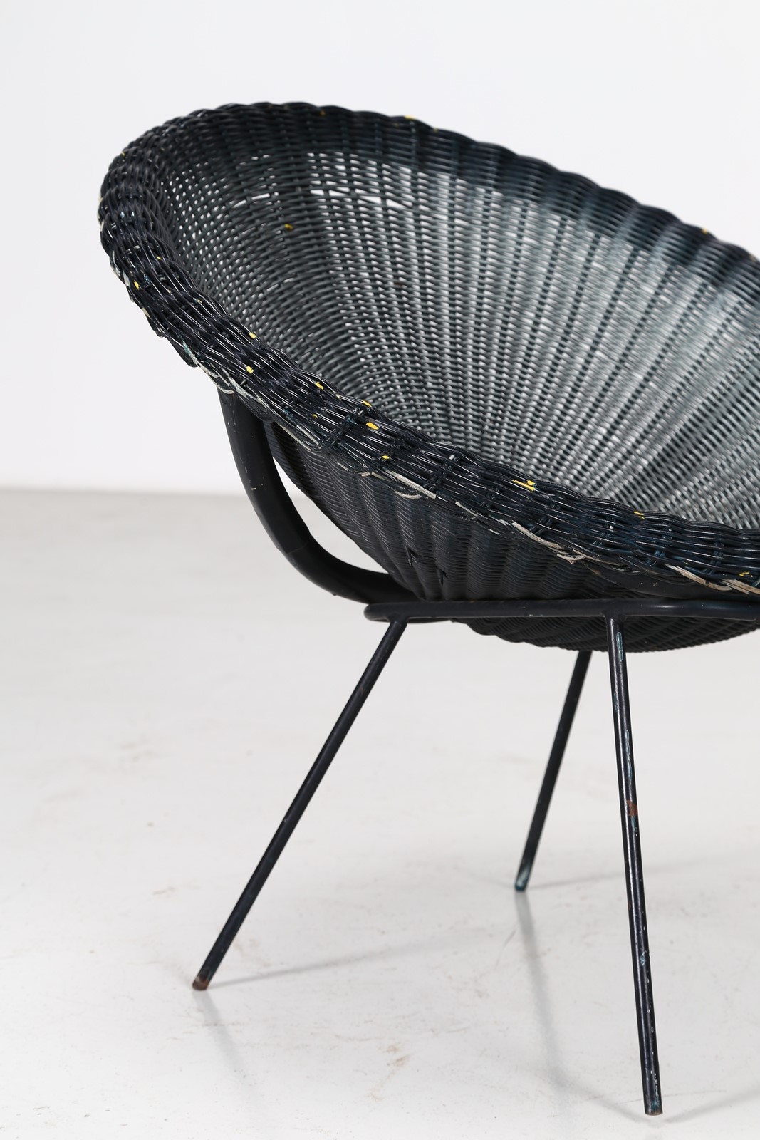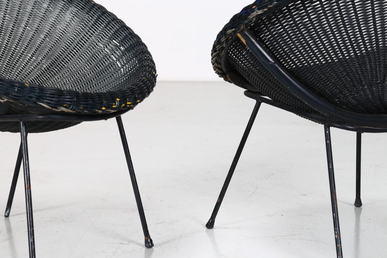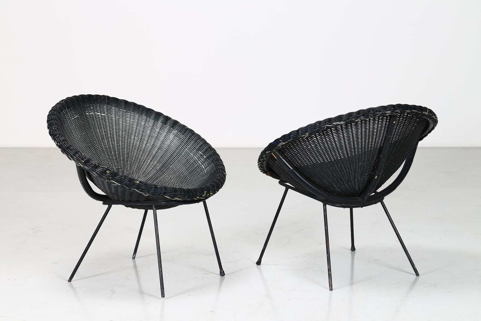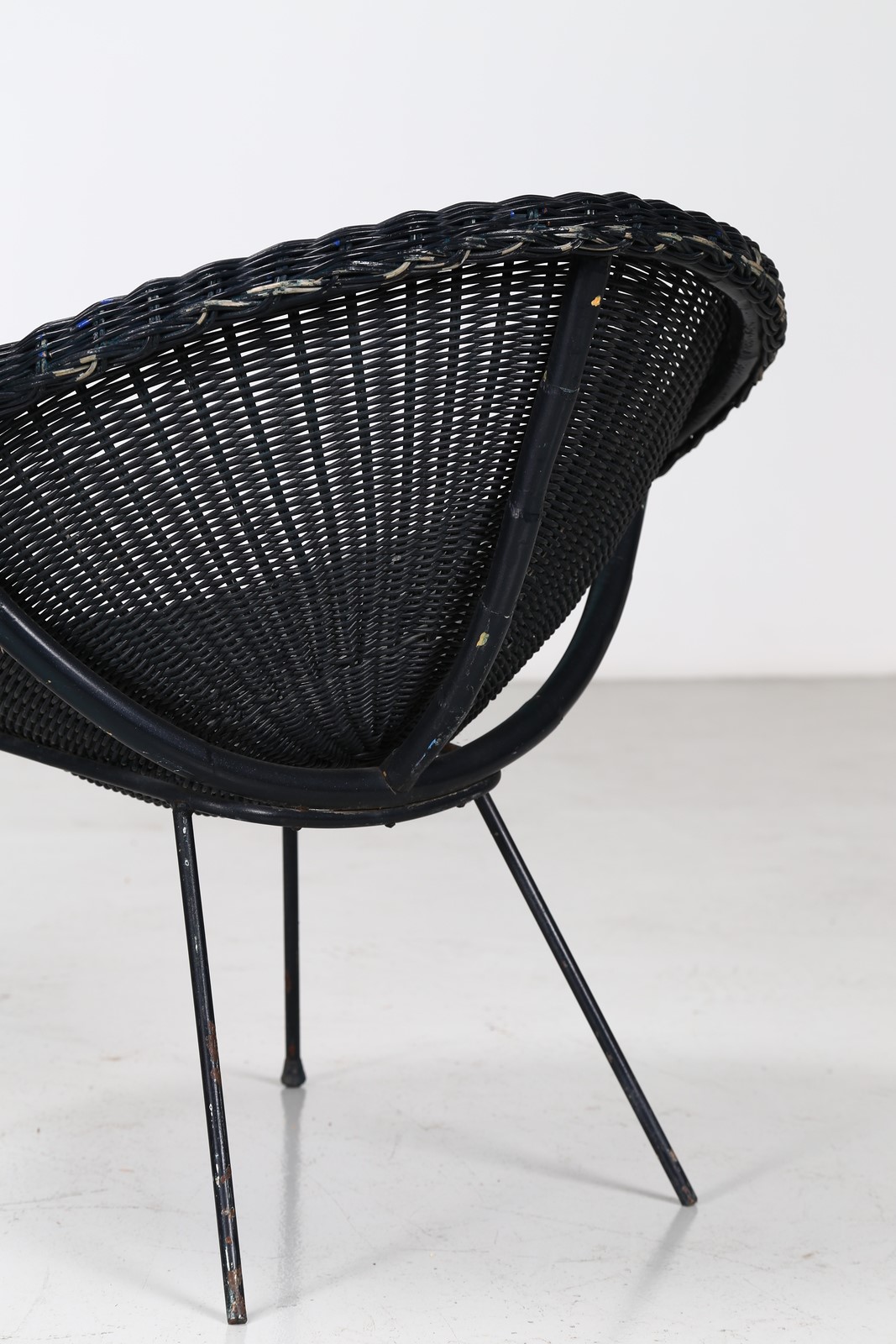 MANIFATTURA ITALIANA Coppia di poltroncine anni 50. -. Cm 72,00 x 70,00 x 62,00. Vimini, metallo laccato e bambu'