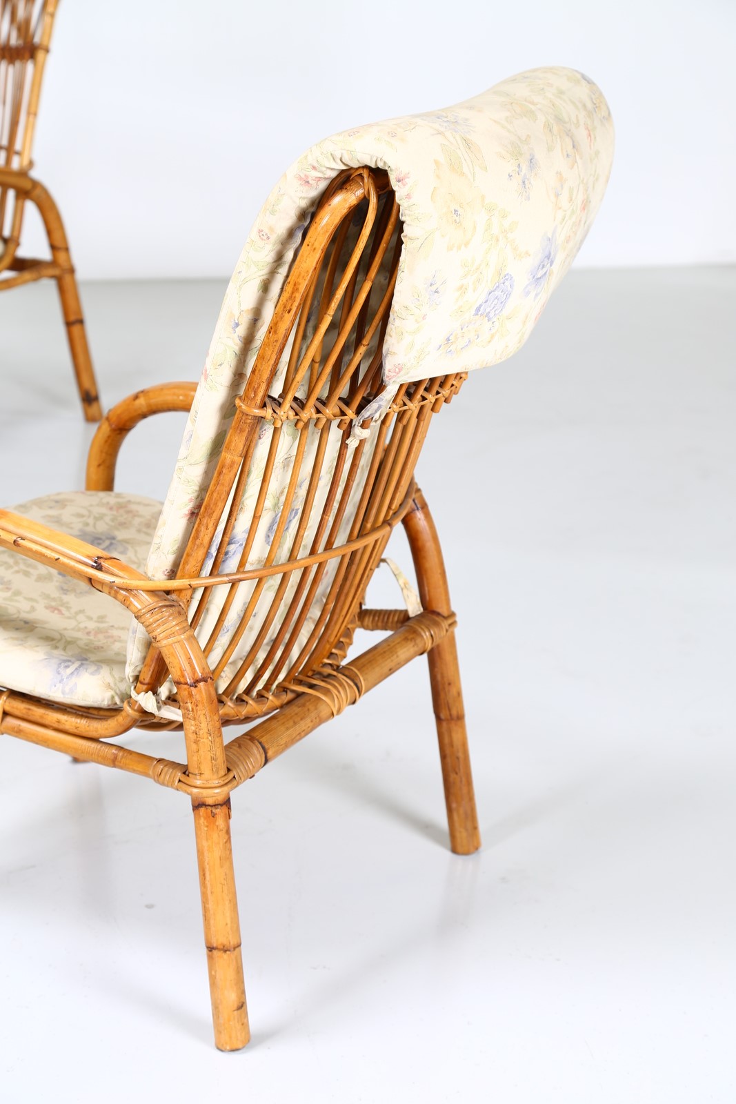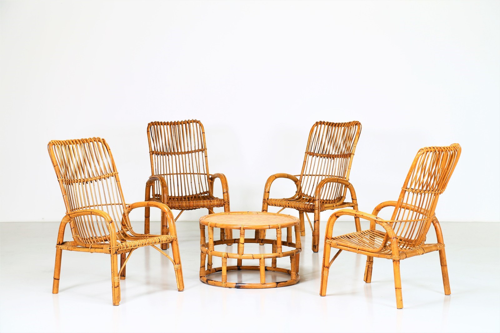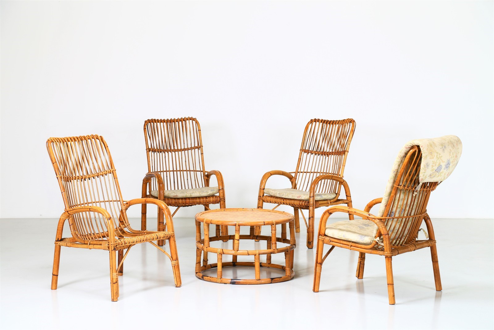 MANIFATTURA ITALIANA Quattro poltrone e un tavolino in vimini, anni 60. -. Cm...