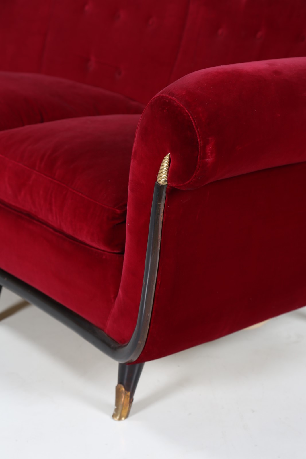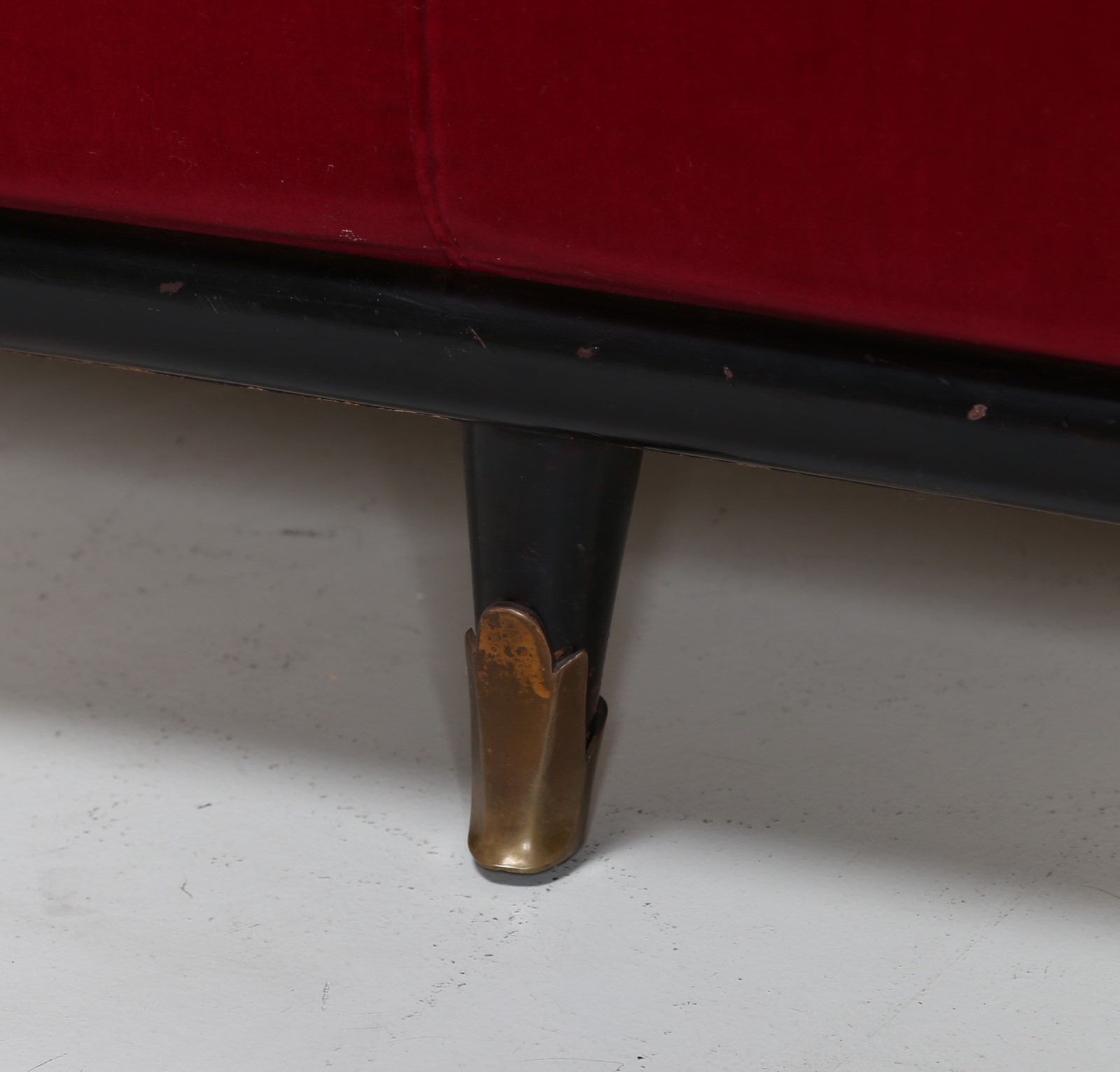 MANIFATTURA ITALIANA Divano in legno con dettagli in ottone e velluto, anni 50 . -. Cm 218,00 x 81,00 x 90,00.