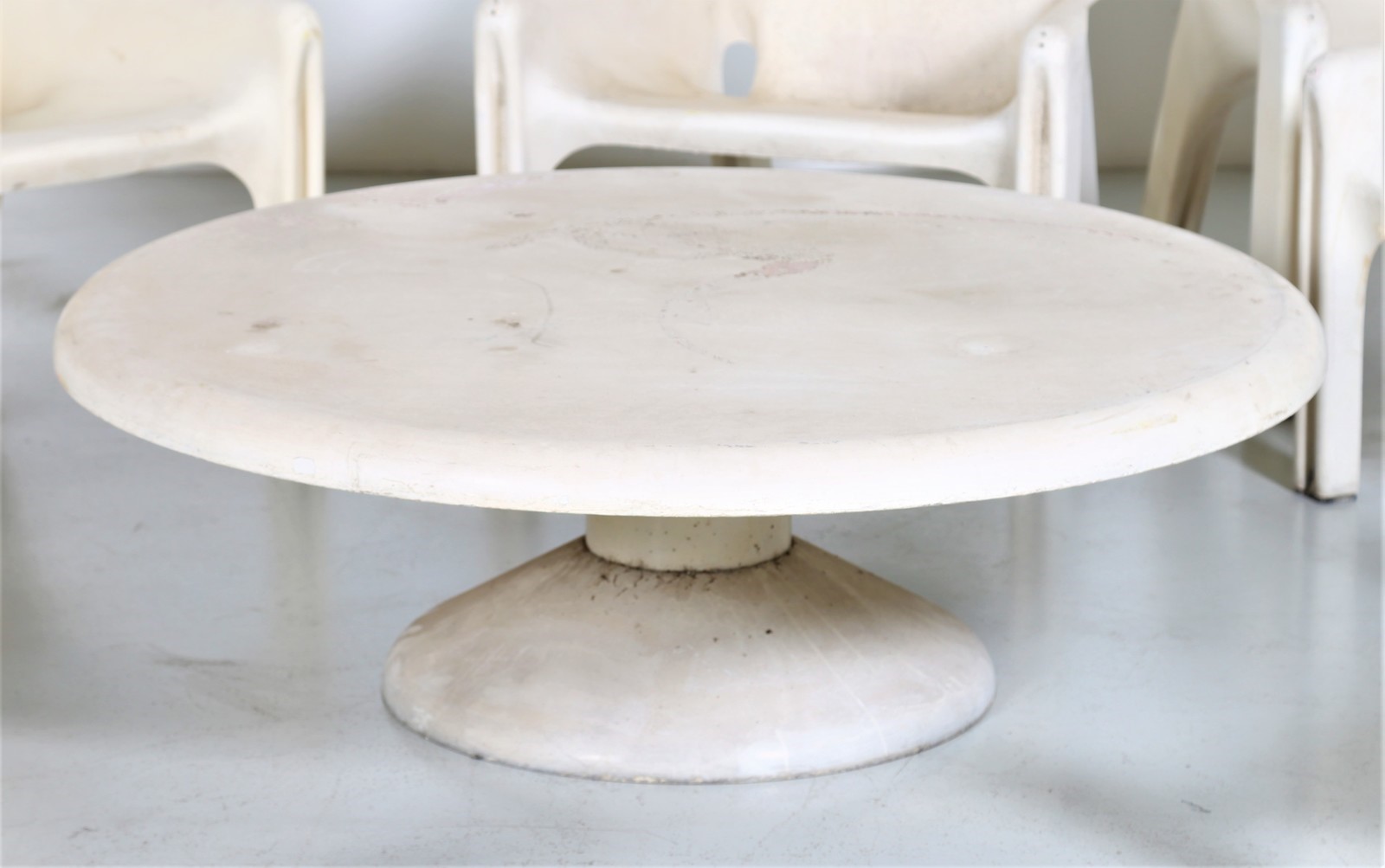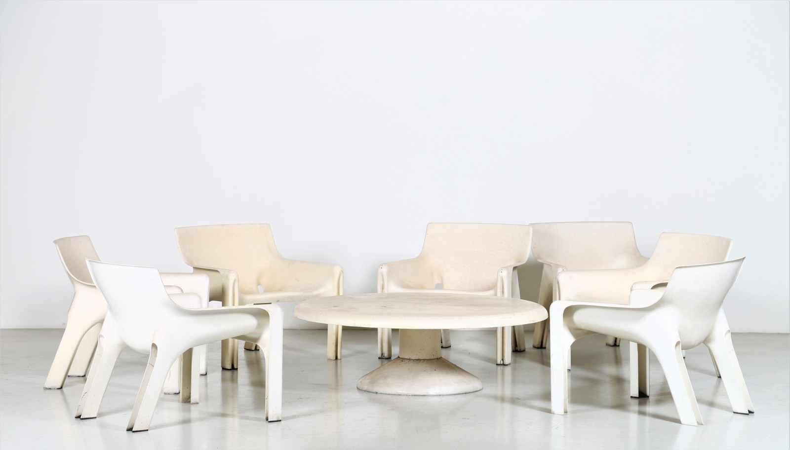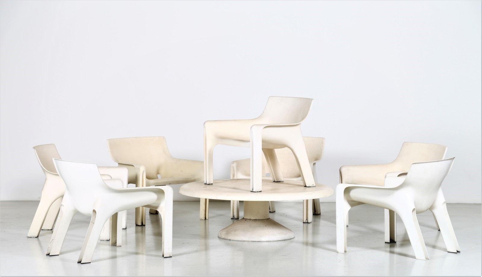 MAGISTRETTI VICO (1920 - 2006) Otto poltrone mod. Vicario, un tavolino Tessera-Mezza Tessera, per Artemide anni 70. Plastica. Cm 72,00 x 68,00 x 60,00. Dimensioni tavolino: 40x120 cm.