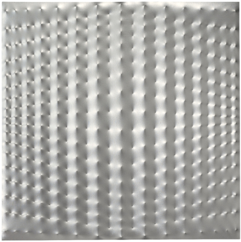 ENRICO CASTELLANI N. 1930 SUPERFICIE ARGENTO signed, titled and dated 1970/73 on the overlap, acrylic on shaped canvas. This work is registered in Archivio Enrico Castellani, Milan, under n. 70-018 and is accompaieid by a photocertificate firmato, intitolato e datato 1970/73 sul risvolto acrilico su tela estroflessa cm 153,5x153,5x5 Opera registrata presso l'Archivio Enrico Castellani, Milano, con il n. 70-018 L'opera è accompagnata da certificato di autenticità su fotografia rilasciato dall'Archivio Enrico Castellani, Milano