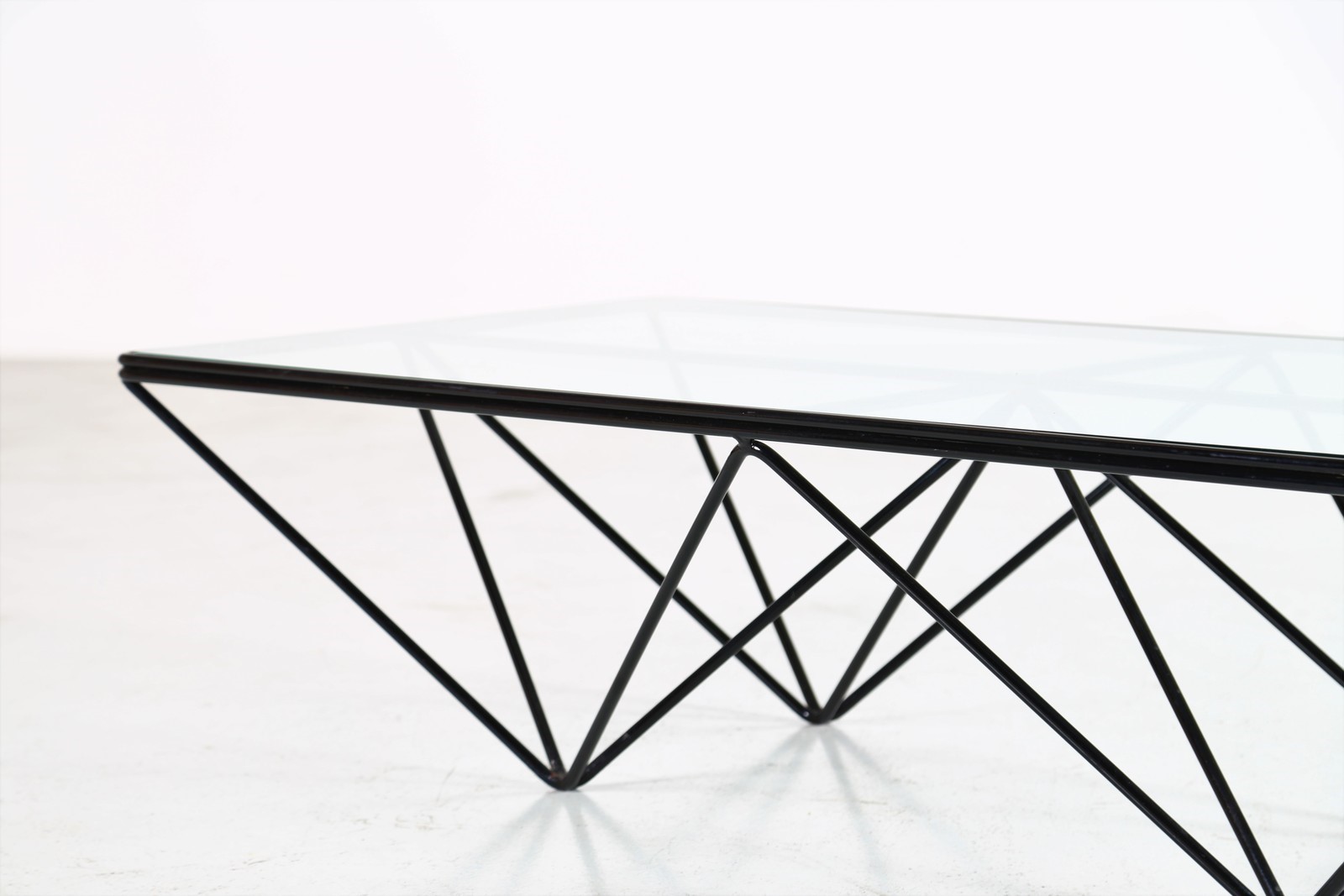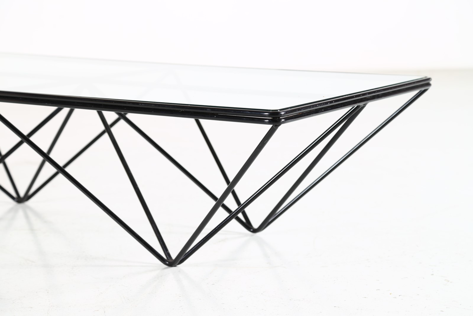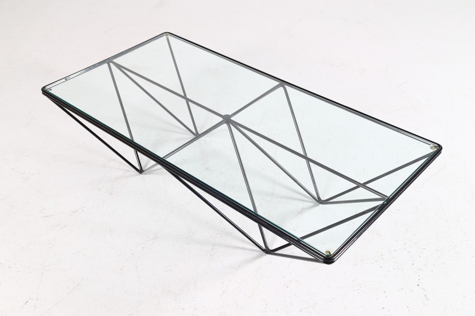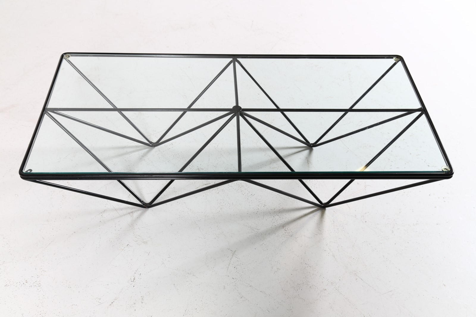 PIVA PAOLO (n. 1950) Tavolino da salotto mod. Alanda, per B&B, anni 80. -. Cm 120,00 x 31,00 x 60,00. Metallo laccato e vetro