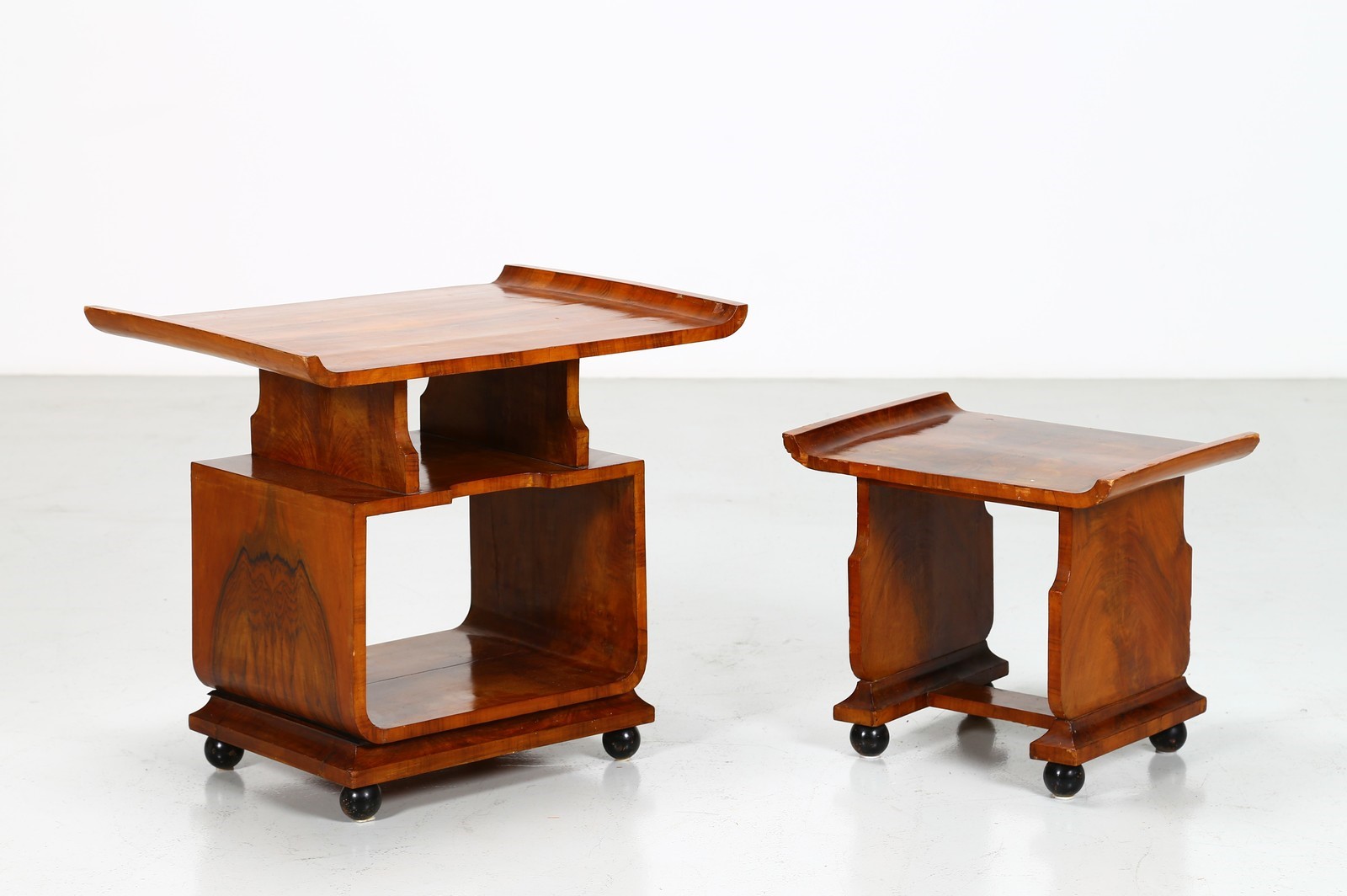 DOMUS NOVA Due tavolini in radica di noce, anni 30 . -. . Misura tavolino grande: H 63 L 70 P 52 " " piccolo: H 44 L 51 P 37