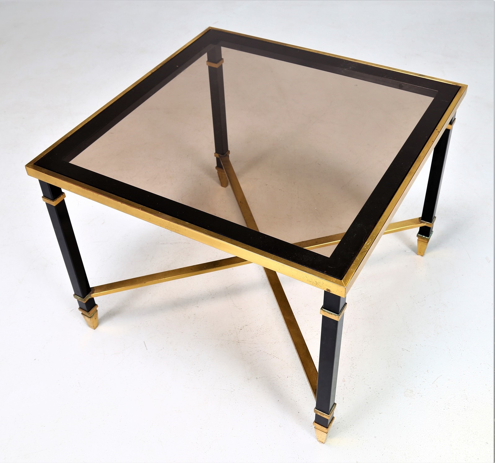 MAISON JANSEN Tavolino in ferro laccato e ottone, piano in cristallo, anni 70 . -. Cm 70,00 x 53,00 x 70,00.