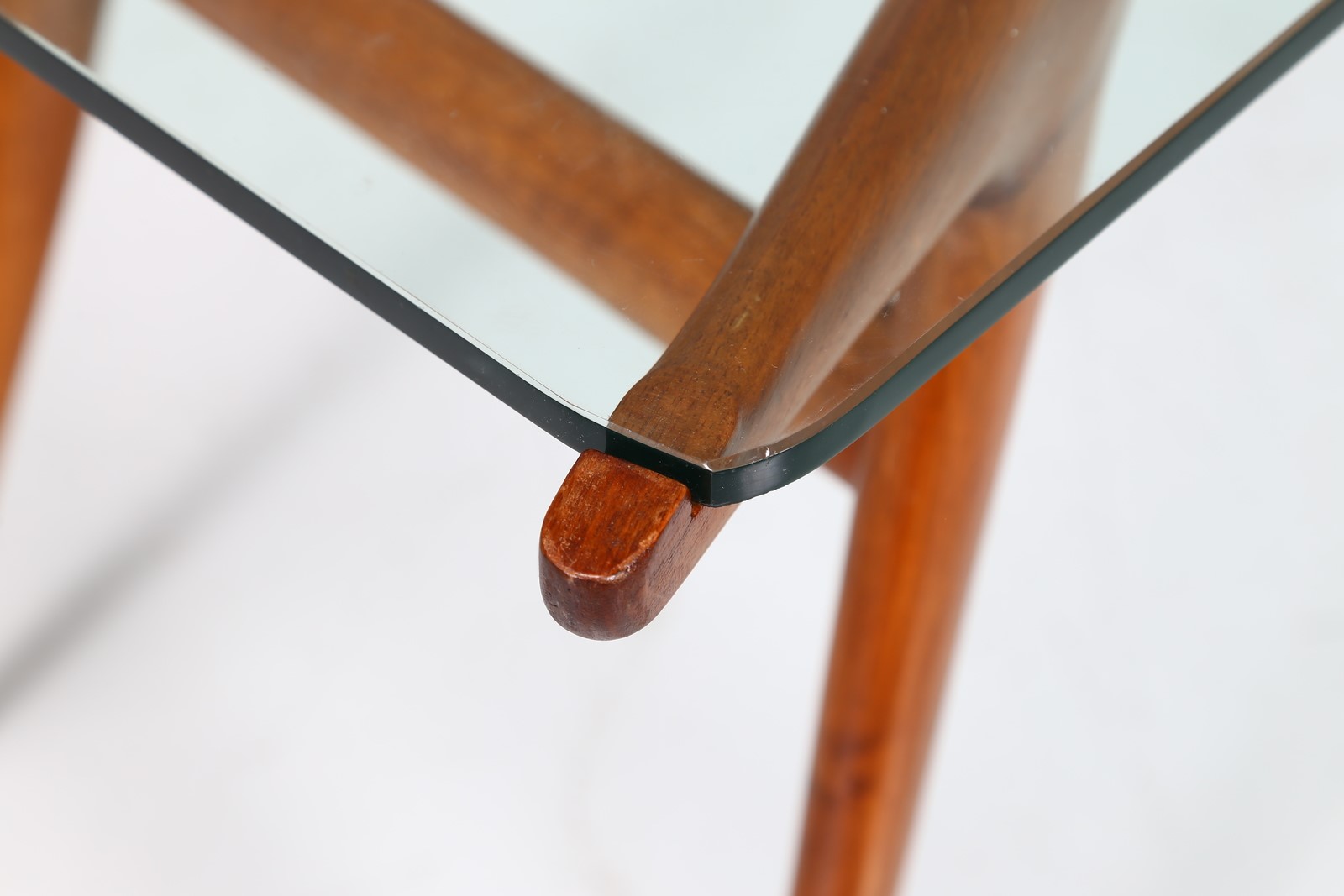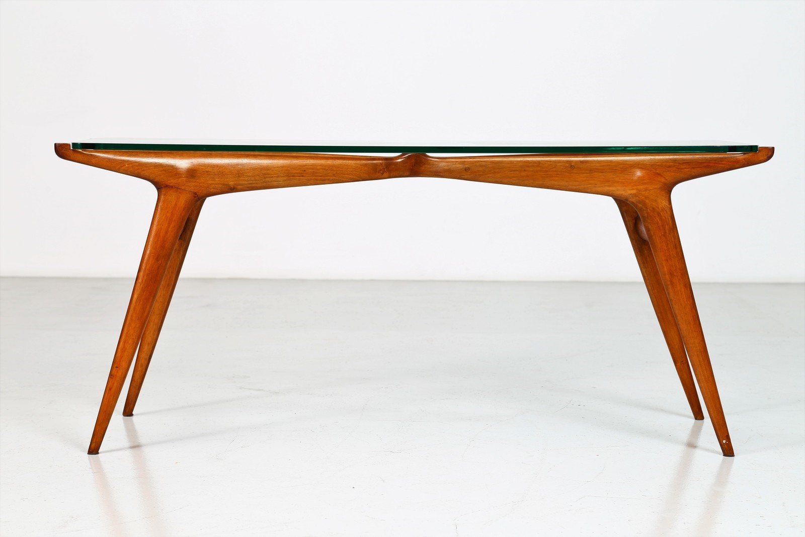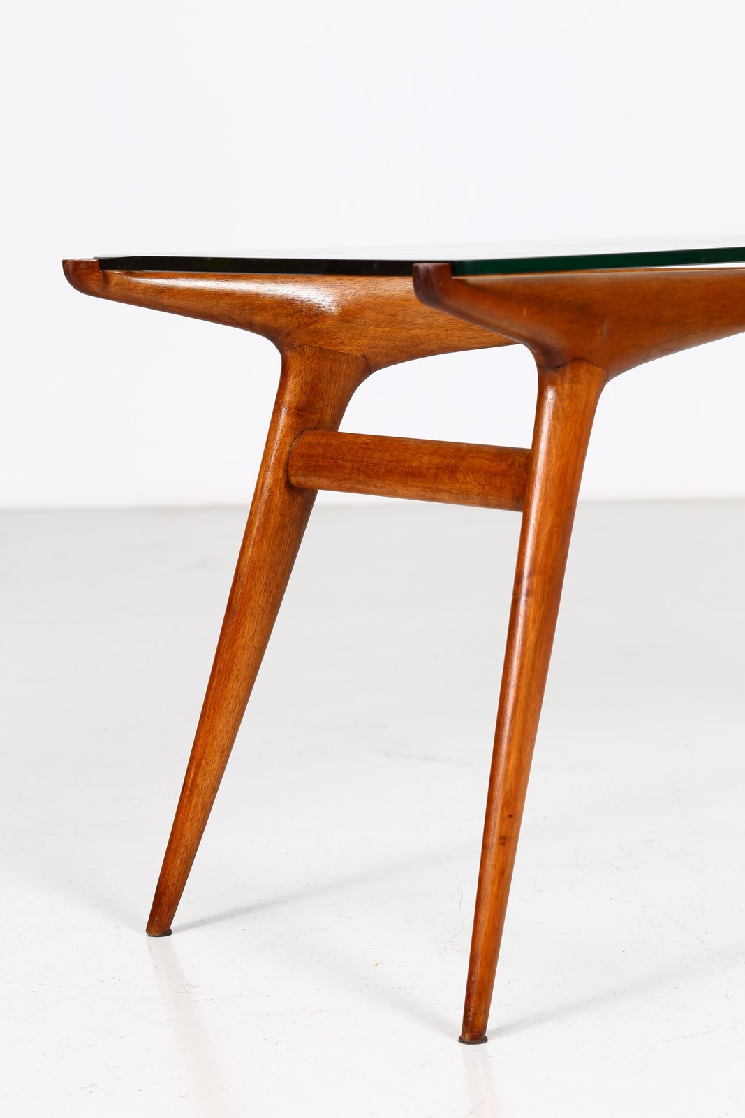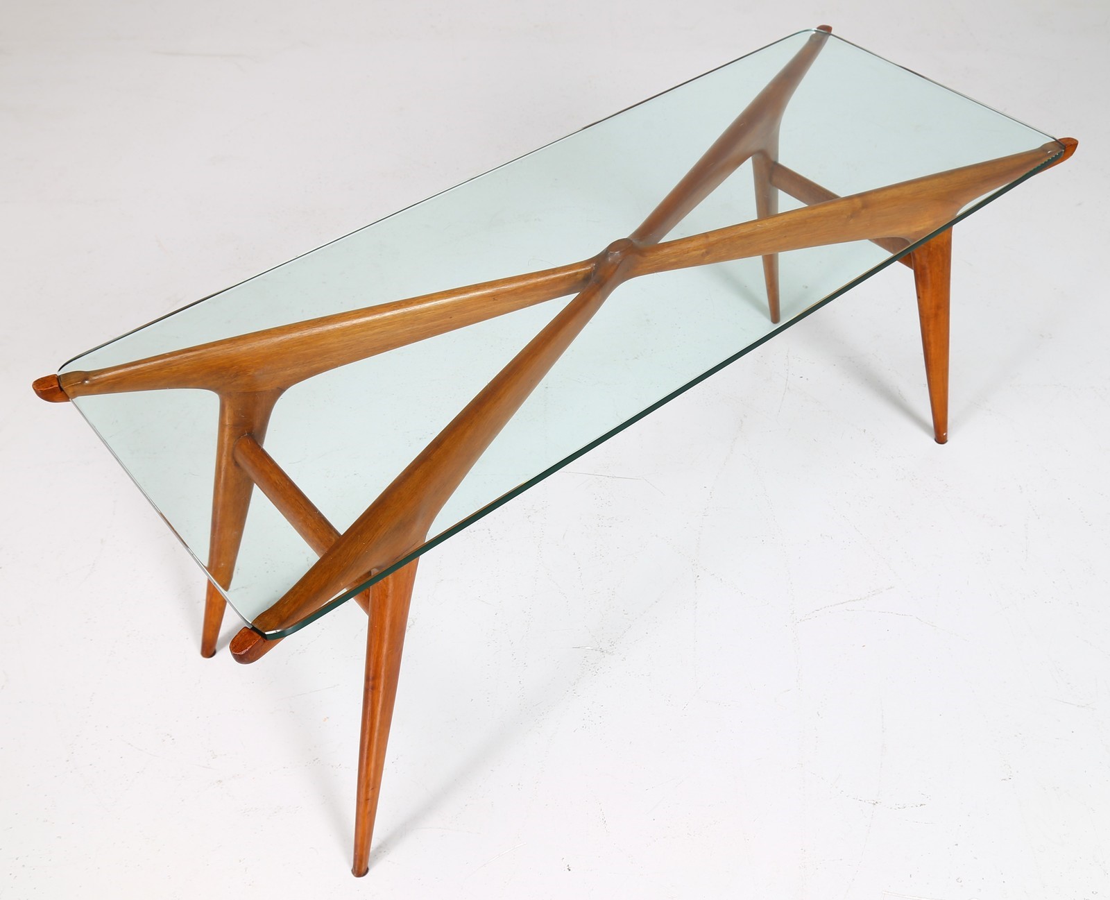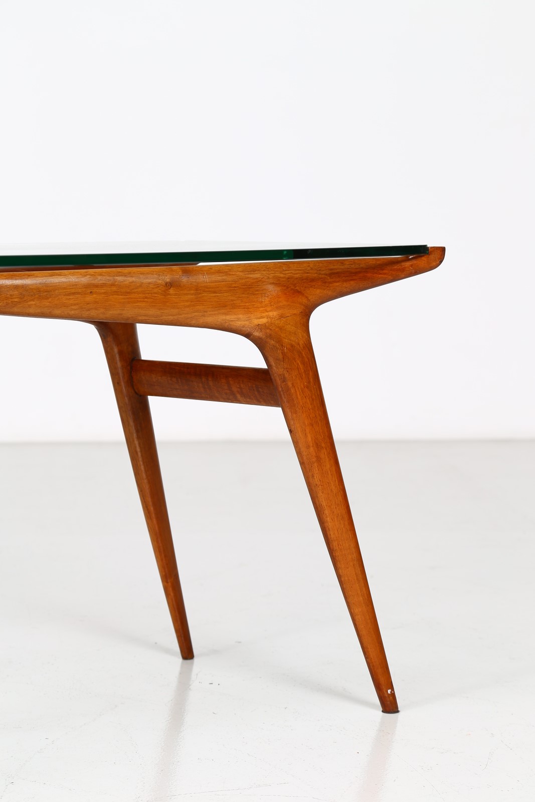 GIORDANI PIERLUIGI Attrib. Tavolino da fumo anni 50. -. Cm 125,00 x 55,50 x 45,00. Legno di noce e cristallo