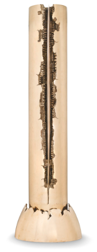 ARNALDO POMODORO N. 1926 SEMICOLONNA A bronze, executed in 1967-1968 in 2 copies plus one artist's proof bronzo altezza cm 215; base diametro cm 36 Eseguito nel 1967-68 in 2 esemplari oltre a 1 prova d'artista EXHIBITED Londra, Marlborough New London Gallery, Arnaldo Pomodoro, 1968, n. 5, illustrato Colonia, Kölnicher Kunstverein, Arnaldo Pomodoro. Werke 1959-1969, 1969 Bruxelles, Palais des Beaux-Arts, Art Actuel en Italie, Europalia 69, 1969, illustrato in copertina Rotterdam, Museum Boymans-van Beuningen, Arnaldo Pomodoro, 1969, pag. 18, illustrato Zurigo, Galerie Semiha Huber, Arnaldo Pomodoro, 1969 Berkeley, University Art Museum, Arnaldo Pomdoro. Sculptures 1960-1970, 1970-71, illustrato pag. S Darmstadt, Freiräume und Foyers des Staatstheaters, Arnaldo Pomodoro. Grossplastiken, 1972, fig. 10 Monaco, Galerie Stangl, Arnaldo Pomodoro '72, 1972, fig. 8 Milano, Rotonda della Besana, Arnaldo Pomodoro, 1974, pag. 54, illustrato Intra, Galleria Corsini, Arnaldo Pomodoro: Disegni, Litografie, Sculture, 1975, tav. 4 Parigi, Musée d'Art Moderne de la Ville de Paris, Arnaldo Pomodoro: Écritures, perforations d'objects, 1976, tav. 14 Atlanta, Colony Square, Georgia State University, Arnaldo Pomodoro, Impressions, 1978, illustrato Caracas, Museo de Bellas Artes, Arnaldo Pomodoro, 1978-1979, n. 5, illustrato Miami, Main Library, Bayfront Park, Arnaldo Pomdoro, 1979 LETTERATURA T. Del Renzio, Arnaldo Pomodoro: Invention of a Sculptural Style, in "Art International", special issue "The 34th Venice Biennale", Lugano n. 6, vol. XII, estate 1968, pagg. 95-98, illustrato C. Doeleman, Pomodoro ingrepen in een creatief proces, in "Nieuwe Rotterdamse Courant", 7 giugno 1969, illustrato M. Pancera, Lavoro come un muratore, in "Oggi illustrato", Milano, n. 23, XXV, 4 giugno 1969, pag. 89, illustrato C. Var der Gerr, De drie periodes van Pomodoro, in "Rotterdams Parool", 25 maggio 1969, illustrato A. Kietzmann, Pomodoro Sculptures Show Basic Simplicity, in "San Diego Union", San Diego, 30 agosto 1970, illustrato M. Valsecchi, I lucidi congegni di uno scultore, in "Il Giornale Nuovo", Milano, 28 giugno 1974, illustrato S. Frigerio, Situazione Parigi, in "D'Ars Agency", Milano n. 81-82, XVII, dicembre 1976, pag. 90, illustrato Arnaldo Pomodoro all'Italsider, in "Corriere del Giorno", Taranto 1977, illustrato G. Marchiori, Arnaldo Pomodoro, in "XX Siècle", Parigi, n. 48, giugno 1977, pagg. 154-155 S. Hunter, Arnaldo Pomodoro, New York, 1982, pag. 83, illustrato F. Gualdoni, Arnaldo Pomodoro Catalogo ragionato della scultura, Milano 2007, vol. II, n. 450, pag. 541, illustrato fronte e retro, illustrato a pag. 129 del vol. I