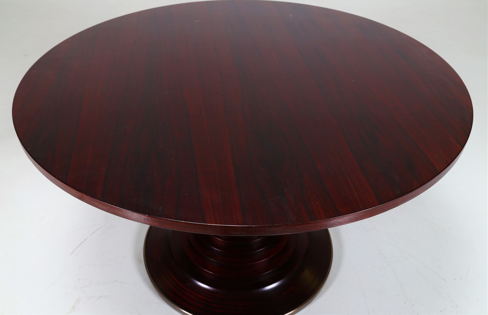 DE CARLI CARLO (1910 - 1999) Tavolo tondo. -. Cm 125,00 x 76,00 x 125,00. Supporto in legno tinto all’anilina, con piano impiallacciato in palissandro, per Sormani 1963. Pubblicazioni; Rivista dell’Arredamento num. 105 settembre 1963 pubblicità;