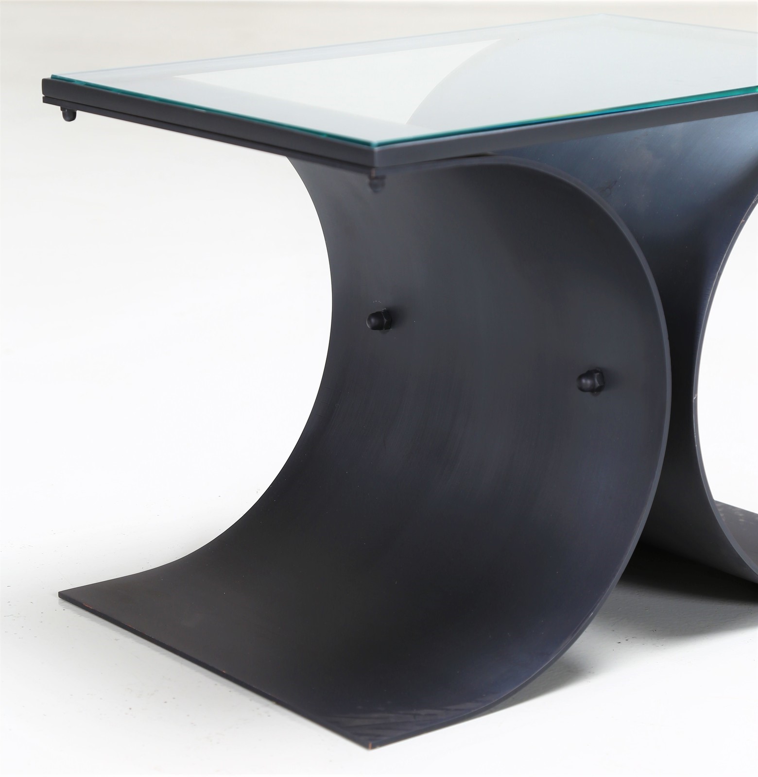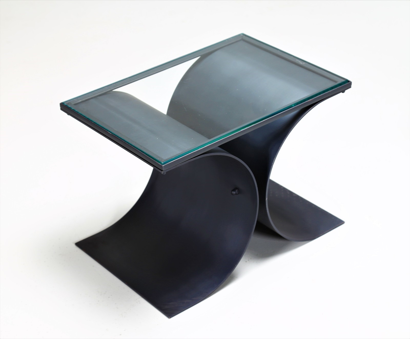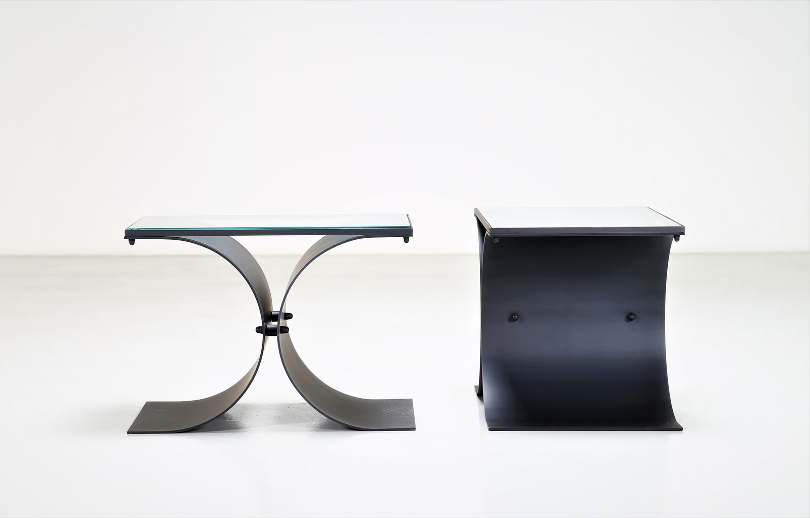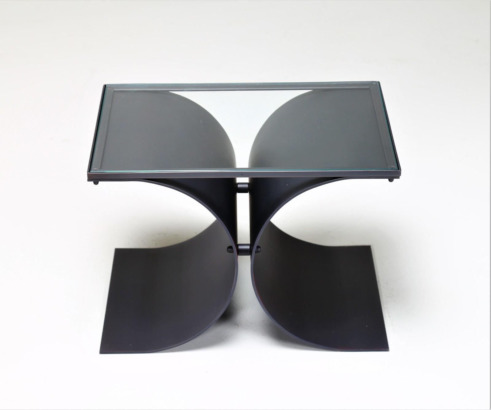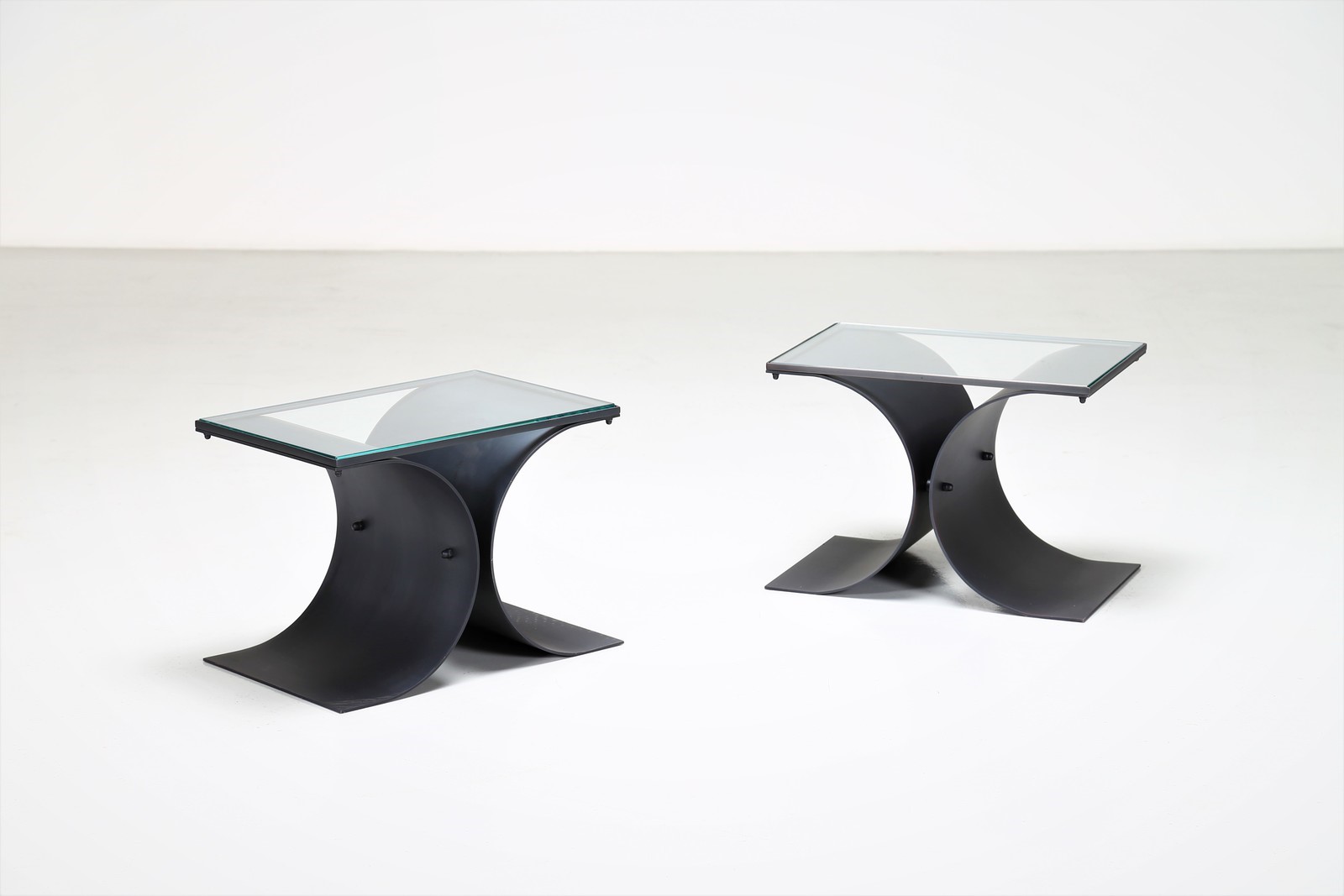 NIEMEYER OSCAR Coppia di tavolini. -. Cm 50,00 x 35,50 x 34,00. In metallo verniciato e piano in cristallo, per Tendo Brasileira anni 60.
