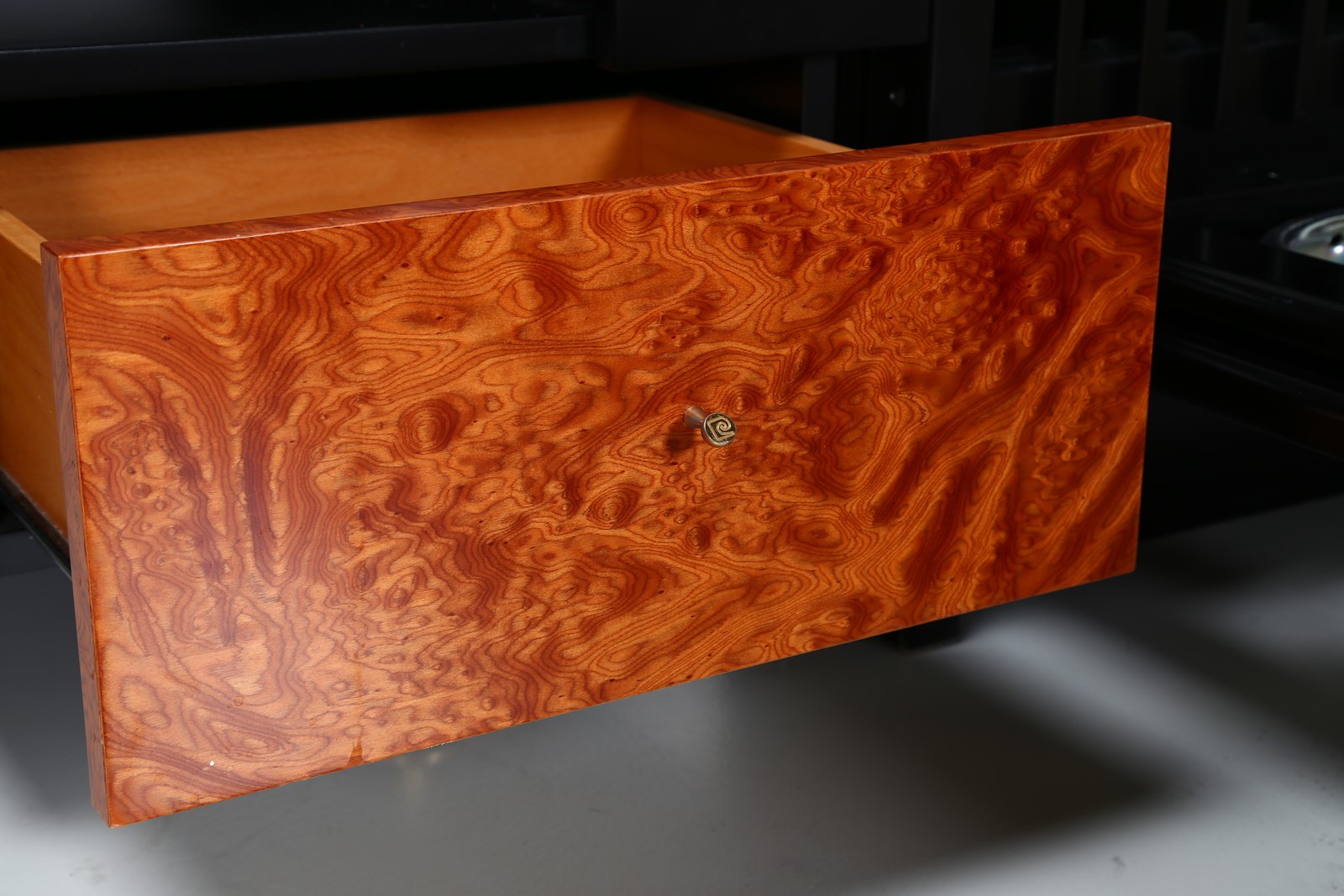CARDIN PIERRE (n. 1922) Letto con comodini in legno, radica, pelle e dettagli...