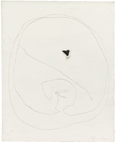 LUCIO FONTANA 1899 - 1968 CONCETTO SPAZIALE signed; signed and titled on the reverse, oil on canvas. Executed in 1961 firmato; firmato e intitolato sul retro olio buchi e graffiti su tela cm 81x65 Eseguito nel 1961 L'opera è accompagnata da attestato di libera circolazione . An export licence is available for this lot. PROVENANCE Galleria Il Punto, Torino Collezione privata, Torino Collezione Antonini, Novara Ivi acquistato dall'attuale proprietario EXHIBITED Rottweil, Neubau der Kreissparkasse Muesum, 3 X monochrom, 2003, pag. 26, illustrato a colori LETTERATURA E. Crispolti, Lucio Fontana, Catalogue Raisonné des peintures, sculptures et environments spatiaux, Bruxelles 1974, vol. II, n. 61 O 74, pagg. 112-113, illustrato E. Crispolti, Lucio Fontana, Catalogo generale, Milano 1986, vol. I, n. 61 O 74, pag. 378, illustrato E. Crispolti, Lucio Fontana, Catalogo generale di sculture, dipinti, ambientazioni, Milano 2006, vol. II, n. 61 O 74, pag. 566, illustrato