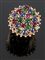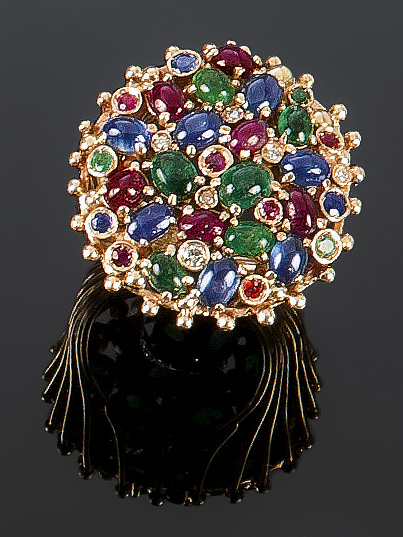 ANELLO Grande anello di forma circolare in oro giallo 12 Kt, sommità in diamanti taglio brillante rotondo per complessivi ct 0,20 ca, zaffiri, rubini e smeraldi taglio cabochon e rotondo Peso gr. 21 Misura 20,5