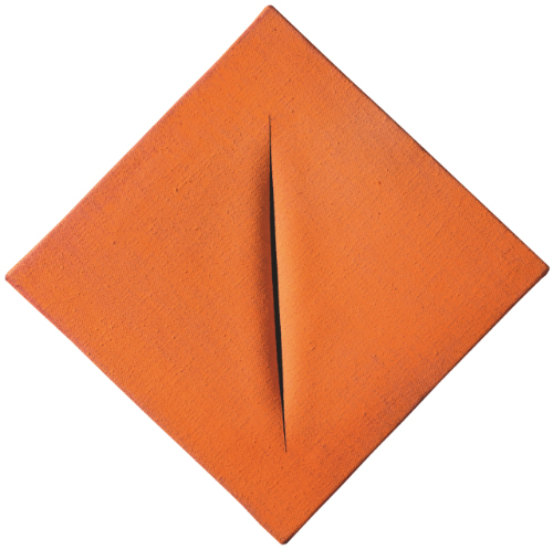 LUCIO FONTANA 1899 - 1968 CONCETTO SPAZIALE, ATTESA signed, inscribed 'oggi mi sono annoiato ad aspettare Castellani me ne vado..', titled on the reverse, waterpaint on canvas. Executed in 1963-64. This work is registered in the Fondazione Lucio Fontana, Milan, under n. 1900/234 and is accompanied by a photocertificate firmato, iscritto oggi mi sono annoiato ad aspettare Castellani me ne vado... e intitolato sul retro idropittura su tela cm 42x42 Eseguito nel 1963-64 Opera registrata presso la Fondazione Lucio Fontana, Milano, con il n. 1900/234 L'opera è accompagnata dal certificato di autenticità rilasciato dalla Fondazione Lucio Fontana, Milano PROVENANCE Acquistato dal padre dell'attuale proprietario direttamente dall'artista
