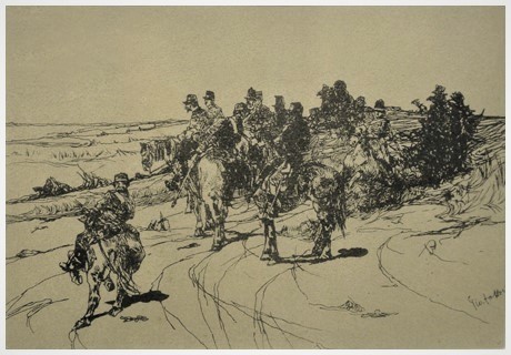 GIOVANNI FATTORI Livorno 1825 – Firenze 1908 In perlustrazione 1884 Litografia a penna. Firma sulla pietra in b. a d. (28,5 x 36 ca. foglio – 18 x 26 lito.) Pubbl.: “Giovanni Fattori / L’opera incisa” catalogo a cura di Andrea Baboni e Giovanni Malesci, Edizioni Over, Milano, 1983, pp.448, 449, 570, 573, tav. CCXI. base: 150
