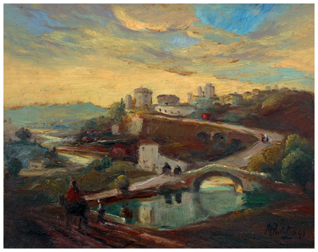 RUTILIO MUTI Vicchio di Mugello 1904 – Vicchio di Mugello 1995 Paesaggio sul Tevere 1946 Olio su tavola 26 x 33,5. Firma e data in b. a d.; sul verso scritte con nome dell’artista, località e titolo. base: 140