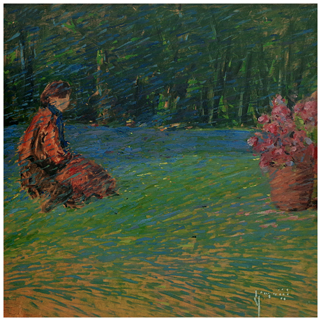 ALDO MAZZI Livorno 1937 Giardino – figura di donna con fiori Olio su tavola 52 x 52. Firma in b. a d.; sul verso etichetta con misure, titolo, località e firma + ritaglio di fotocopia con articolo sull’artista. base: 100