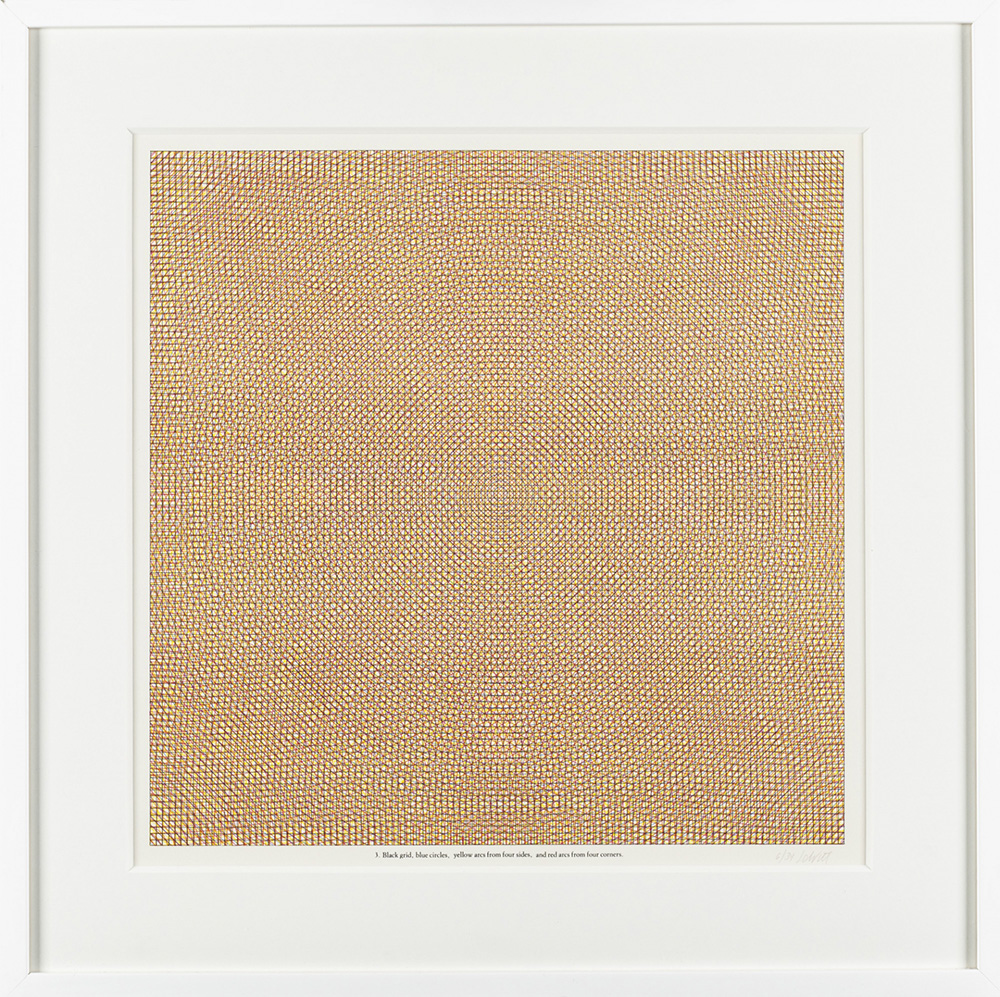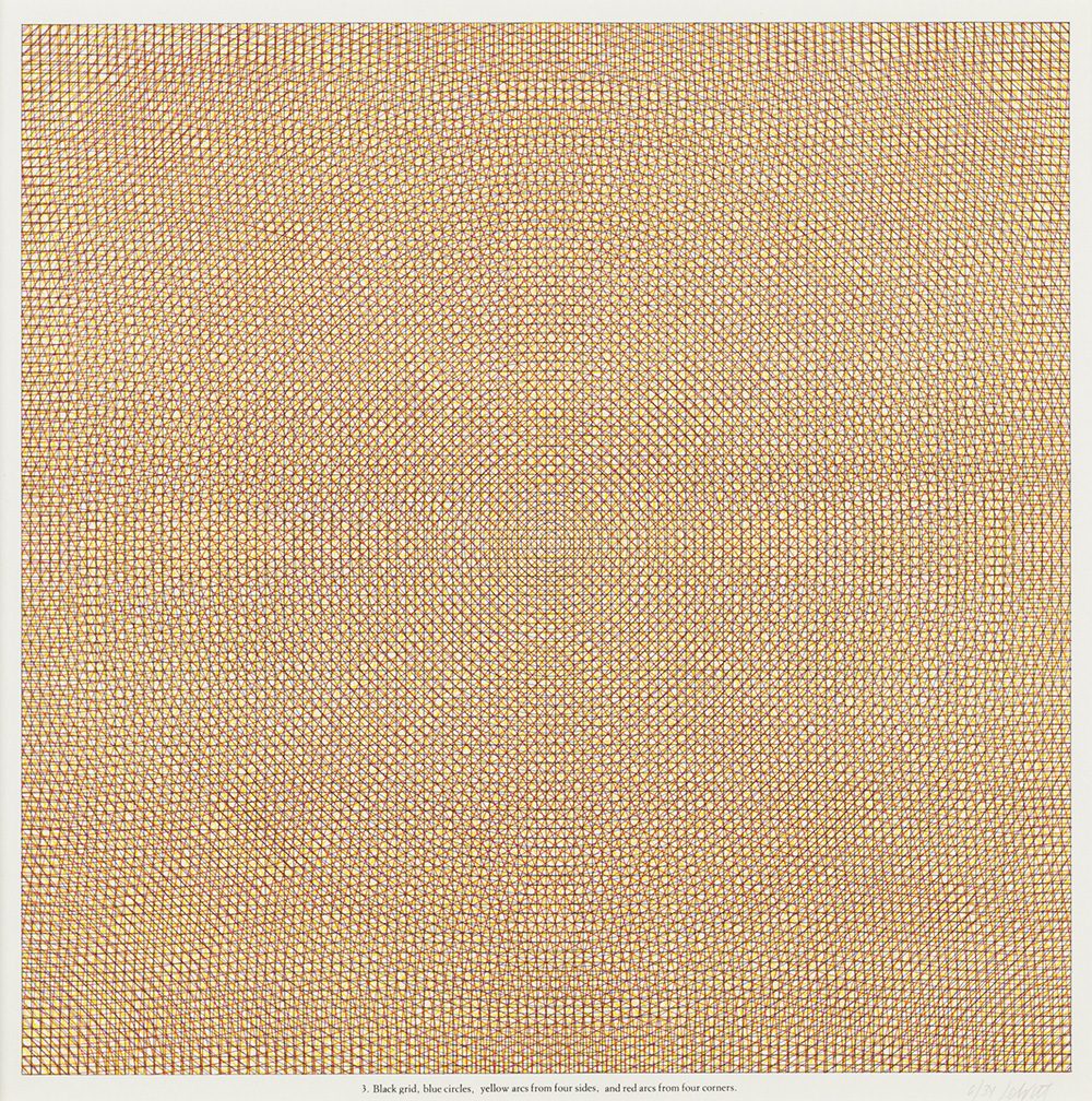 Sol Lewitt 1928 - 2007 Black grid, blue circles, yellow arcs from four sides,...