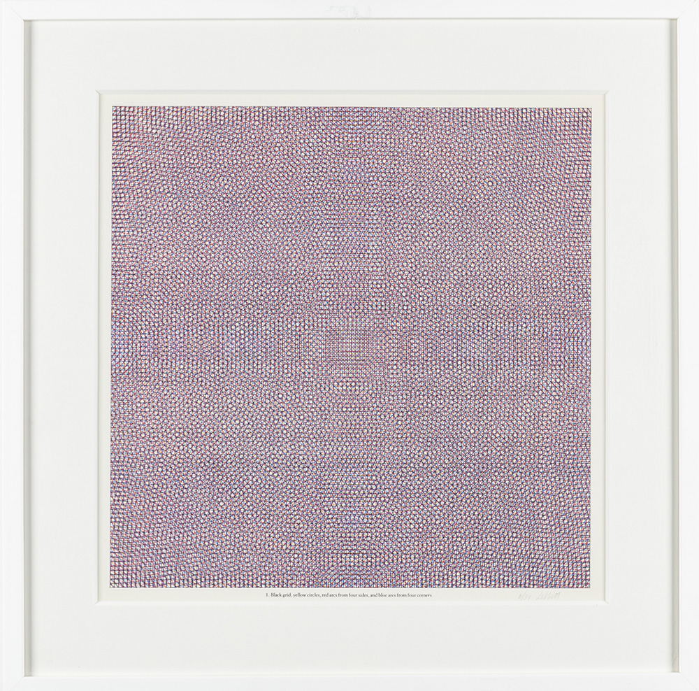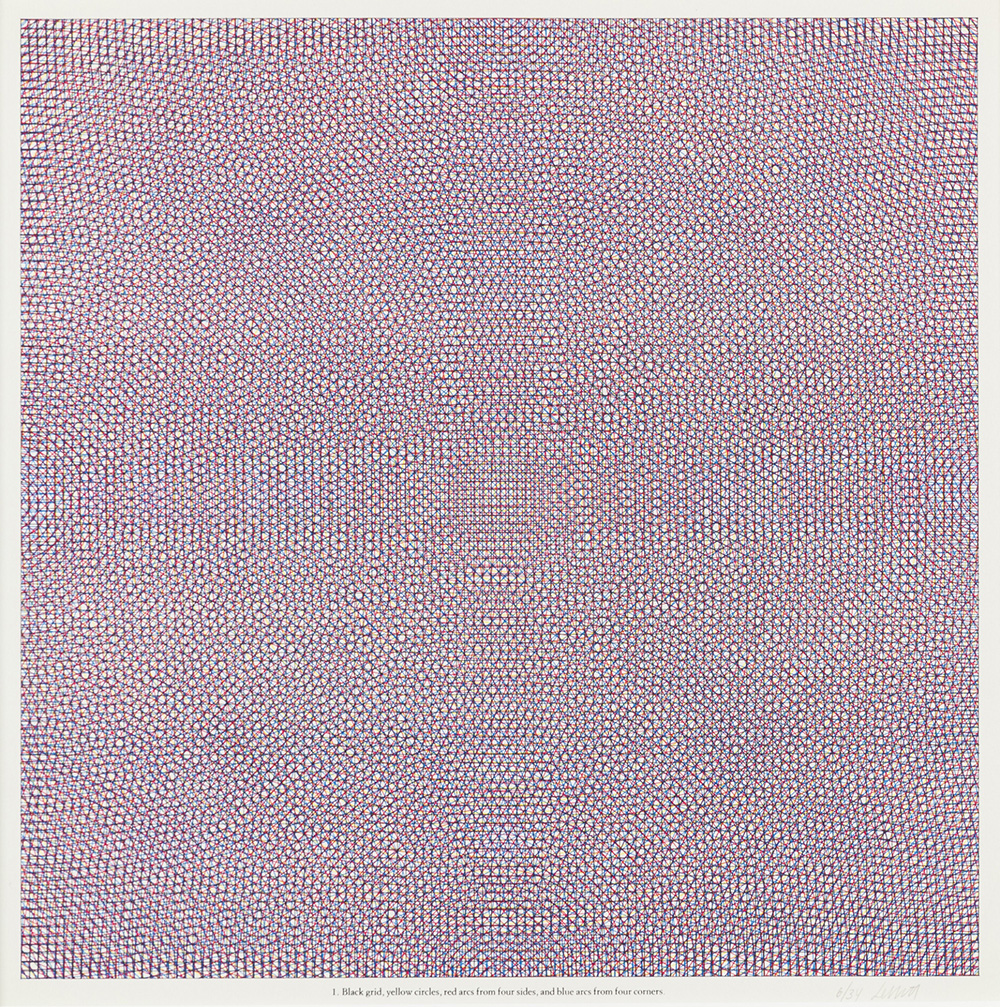 Sol Lewitt 1928 - 2007 Black grid, yellow circles, red arcs from four sides,...