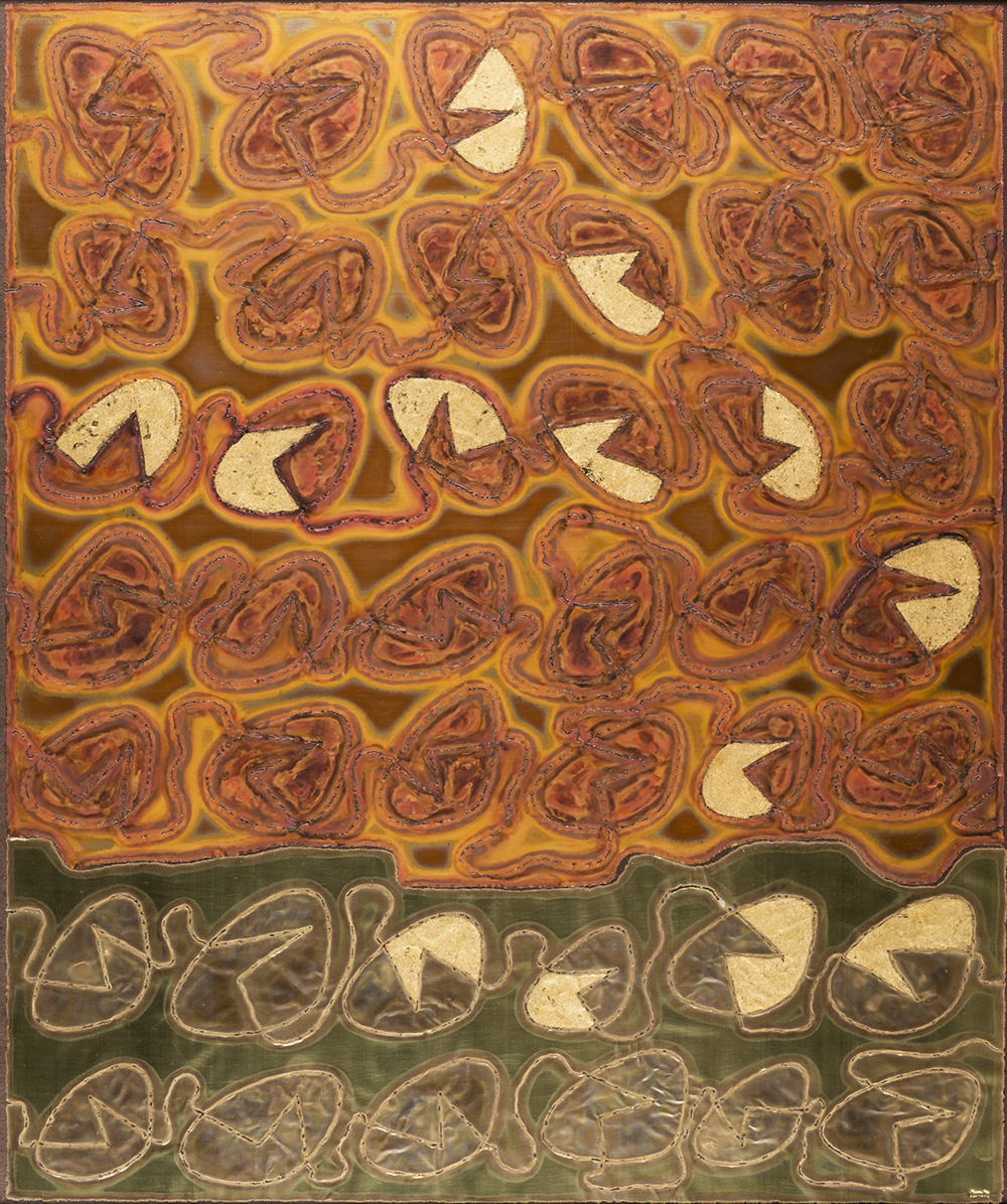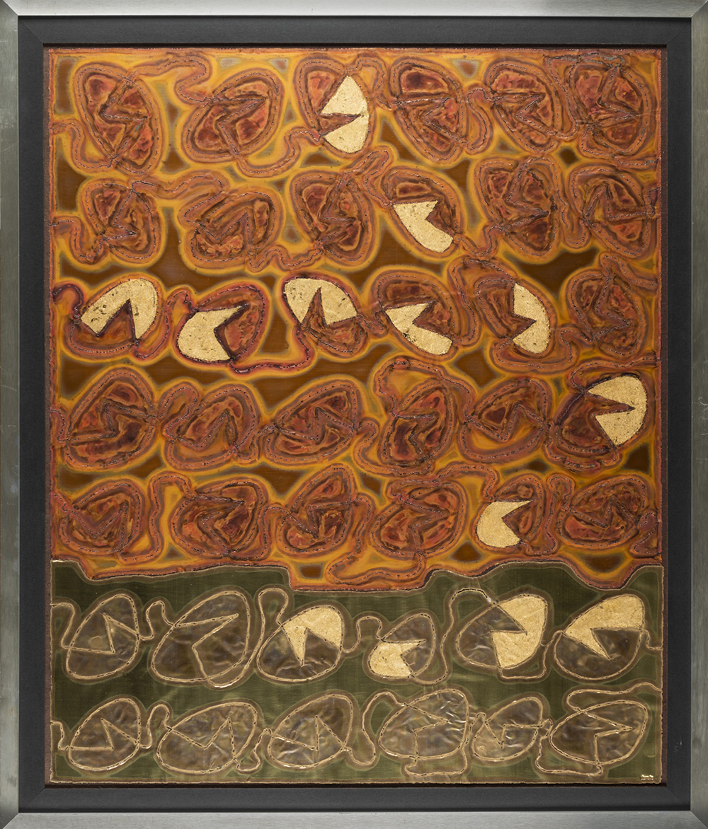 Angelo Bozzola 1921 - 2010 Superficie - 1966 tecnica Intaglio e incisione ossidrica su ottone e bronzo Dimensioni cm. 80 x 68 Firma Firmato in basso a destra Documenti Autentica su fotografia a cura della Fondazione Angelo Bozzola, Galliate Note Adesivo Archivio Angelo Bozzola sul retro Provenienza Collezione Privata