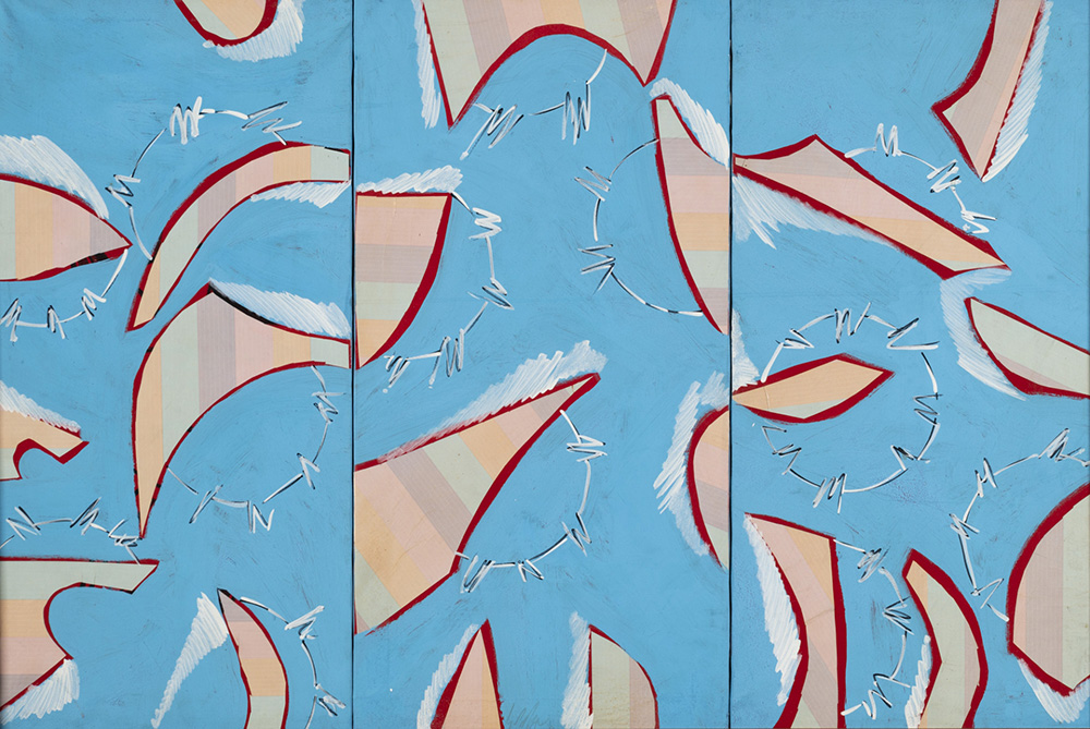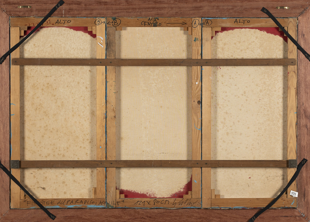 Sergio Dangelo 1932 Finestre del paradiso, aquile - ages '60 tecnica Trittico, tecnica mista e collage su tela Dimensioni cm. 80 x 120 (cm. 80 x 40 cad.) Firma Firmato in basso al centro Provenienza Collezione Privata