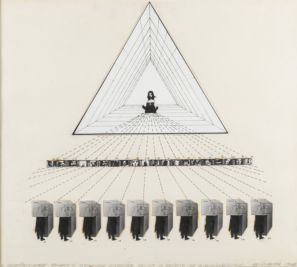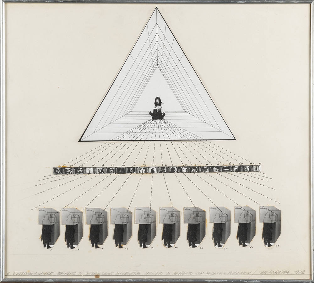 Ugo La Pietra 1938 Il videocomunicatore strumento di informazione alternativa applicato al rapporto con la cellula abitativa - 1972 tecnica Tecnica mista e collage su carta Dimensioni cm. 40 x 44 Firma Firmato e datato in basso a destra Documenti Autentica dell'artista su fotografia Provenienza Collezione Privata