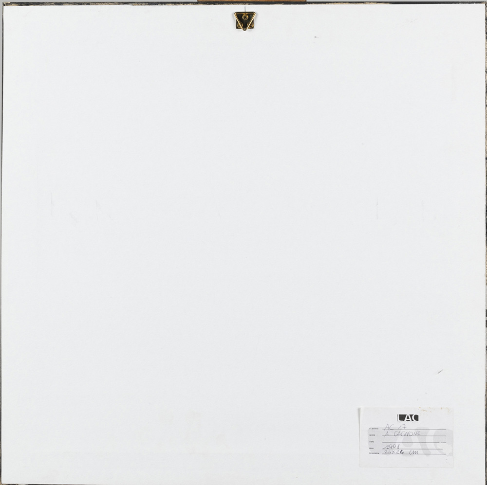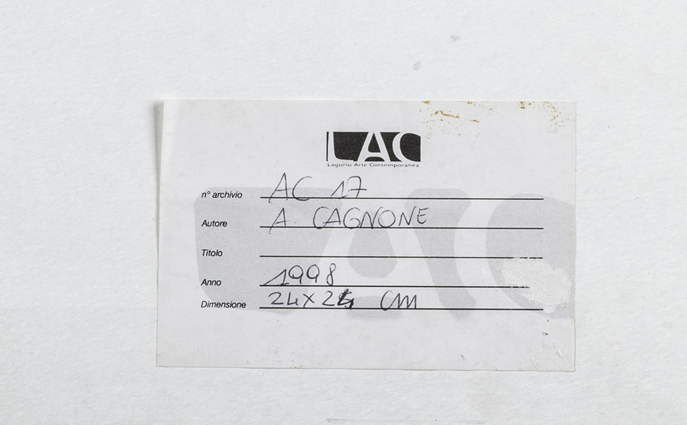 Angelo Cagnone 1941 Senza titolo - 1998 tecnica Tecnica mista e collage su carta Dimensioni cm. 23,5 x 23,5 Firma Firmato e datato in basso a sinistra Documenti Certificato di Garanzia e Provenienza Orler Gallerie d’Arte Note Etichetta Lagorio Arte Contemporanea, Brescia sul retro Provenienza Collezione Privata