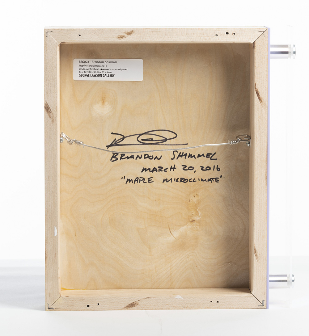 Brandon Shimmel 1983 Marple Microclimate - 2016 tecnica Acrilico, lastra acrilica, alluminio su pannello di legno Dimensioni cm. 35,6 x 31,5 Firma Firmato e datato sul retro Note Etichetta George Lawson Gallery, San Francisco sul retro Provenienza Collezione Privata