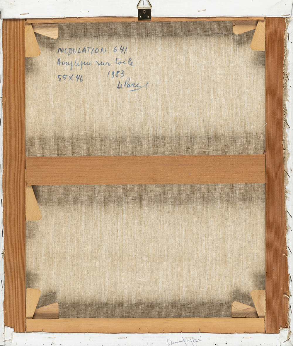 Julio Le Parc 1928 Modulation 641 - 1983 tecnica Acrilico su tela Dimensioni cm. 55 x 46 Firma Firmato e datato sul retro Note Timbro Galleria Sincron, Brescia con firma di Armando Nizzi sul retro Provenienza Collezione Privata
