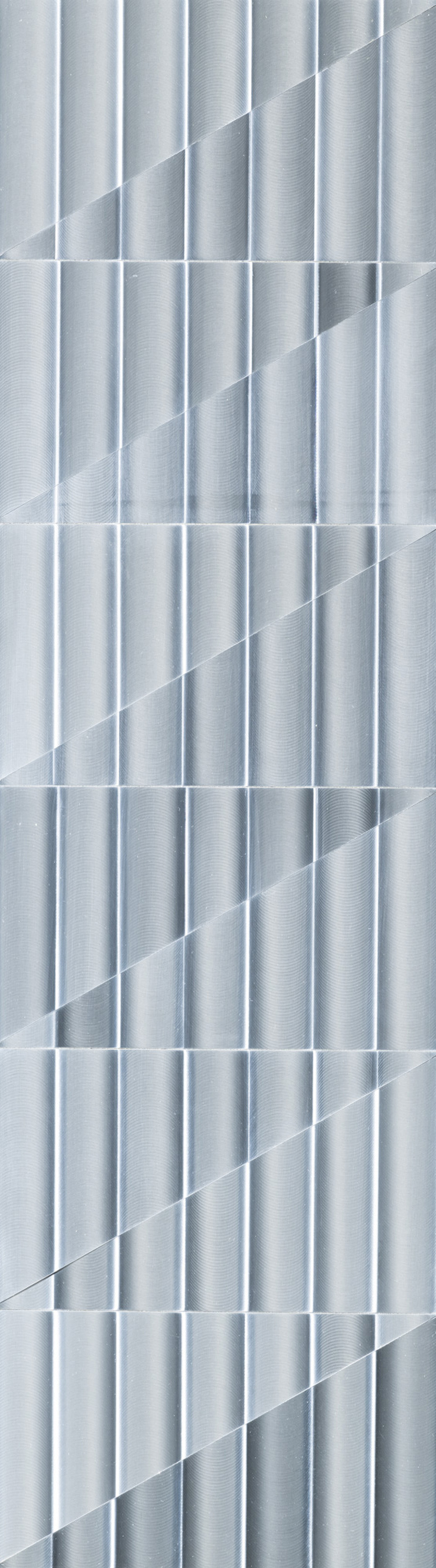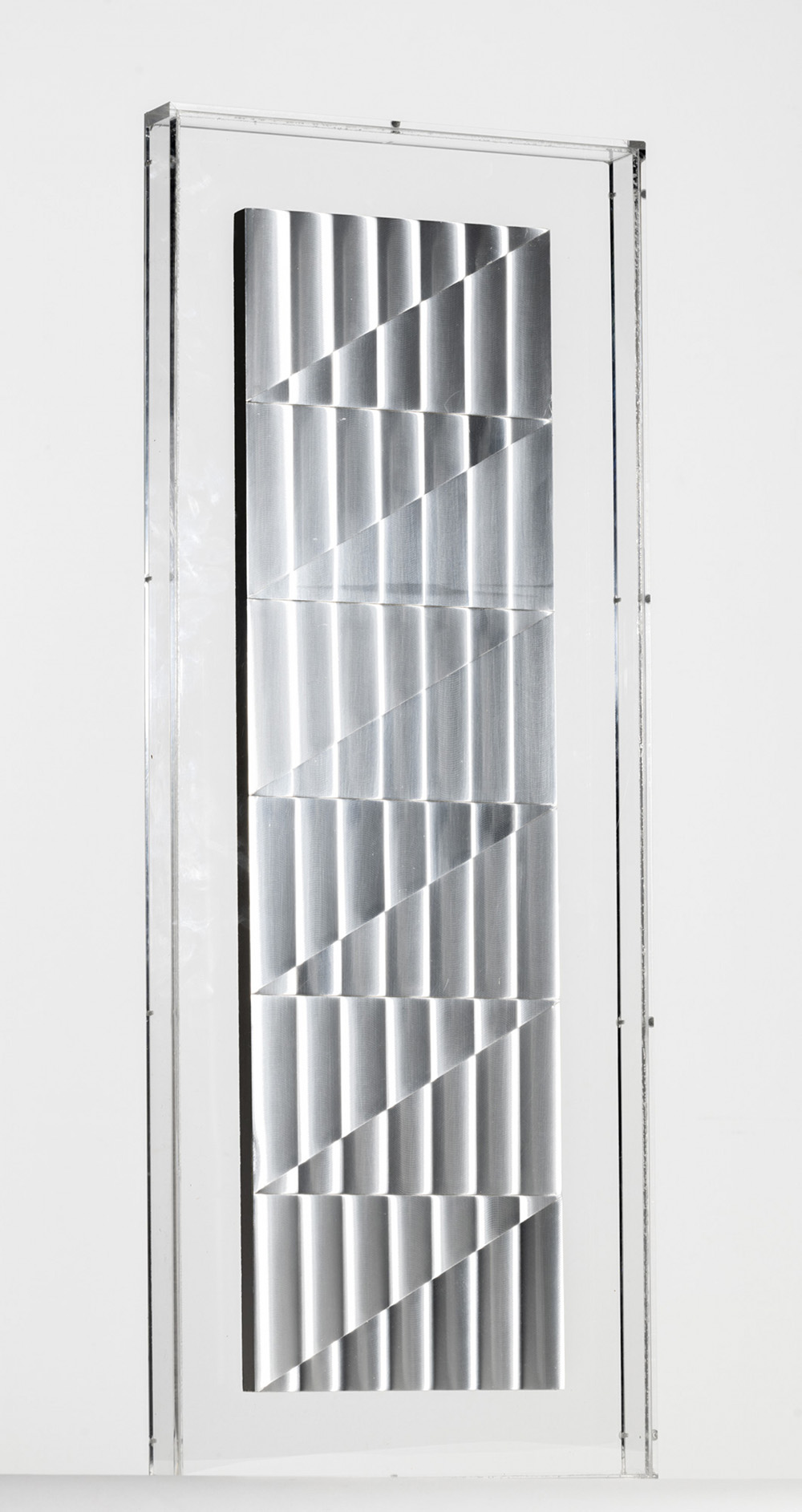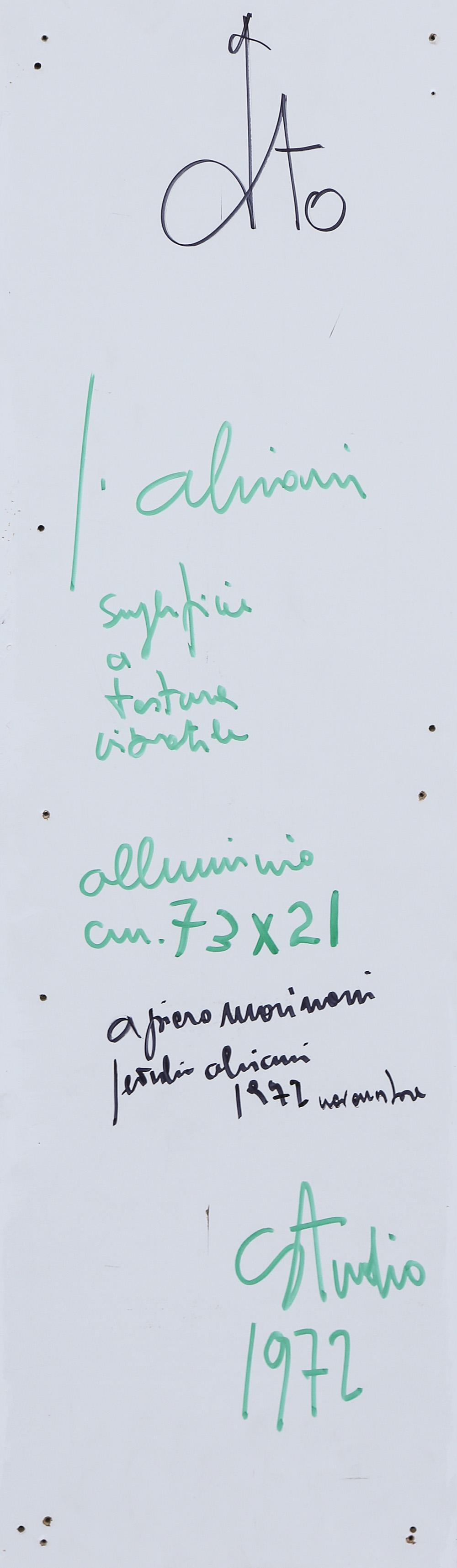 Getulio Alviani 1939 - 2018 Superfici a testura vibratile - 1972 tecnica Alluminio su tavola Dimensioni cm. 73 x 21 Firma Firmato e datato sul retro Note Dedica dell’artista sul retro Provenienza Collezione Privata