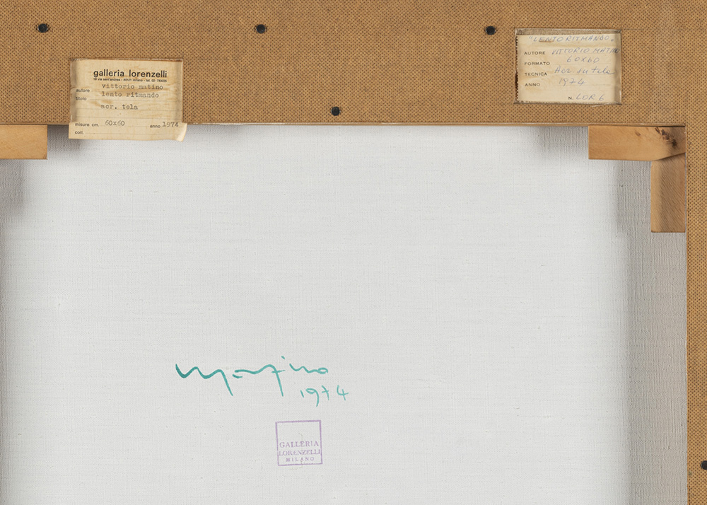 Vittorio Matino 1943 Lento ritmando - 1974 tecnica Acrilico su tela Dimensioni cm. 60 x 60 Firma Firmato e datato sul retro Note Etichetta e timbro Galleria Lorenzelli, Milano sul retro Provenienza Collezione Privata