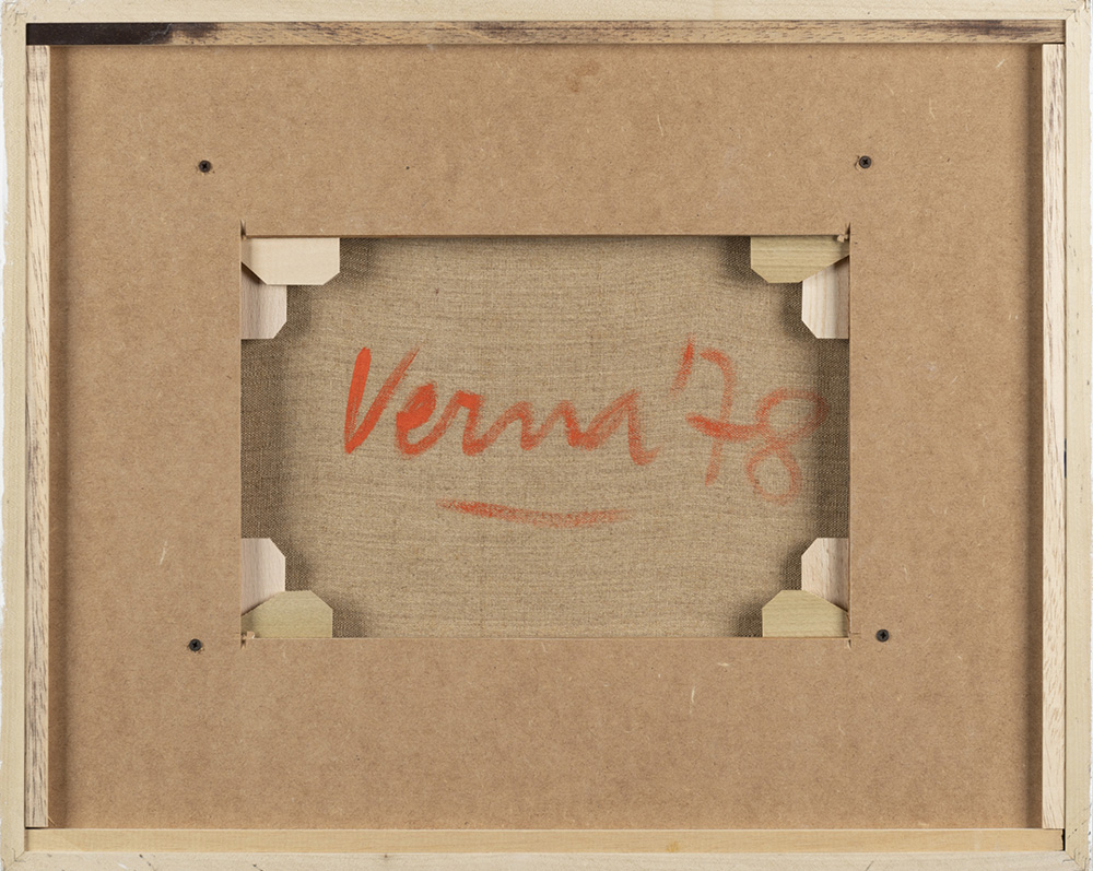 Claudio Verna 1937 Senza titolo - 1978 tecnica Olio su tela Dimensioni cm. 30 x 40 Firma Firmato e datato sul retro Documenti Autentica dell'artista su fotografia Note Etichetta Chisel srl, Genova sul retro Etichetta Katia srl, Genova sul retro Provenienza Collezione Privata