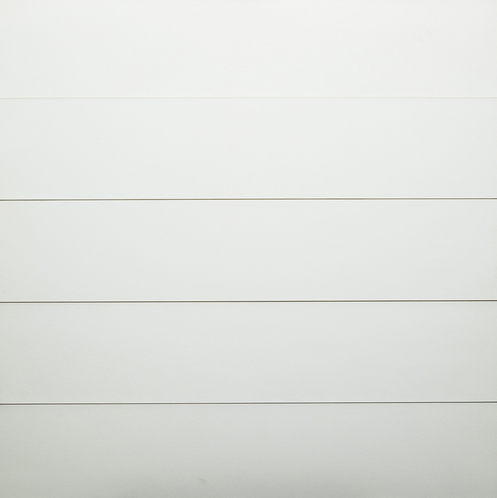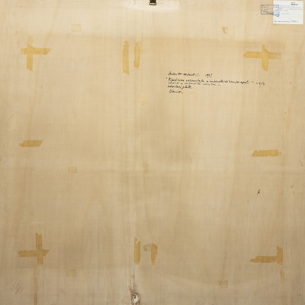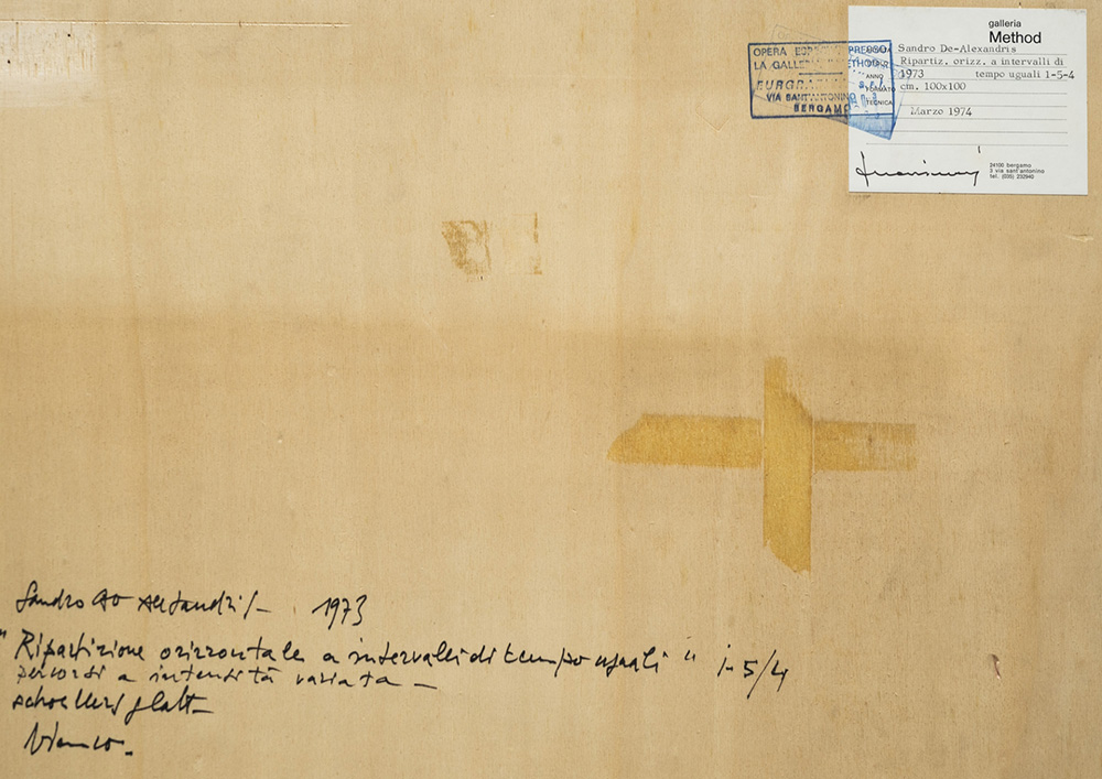 Sandro De Alexandris 1939 Ripartizione orizzontale a intervalli di tempo uguali i-5/4 - 1973 tecnica Cartoni Schoeller incisi sovrapposti su tavola Dimensioni cm. 99 x 99 Firma Firmato e datato sul retro Note Etichetta e timbro Galleria Method, Bergamo sul retro Provenienza Collezione Privata