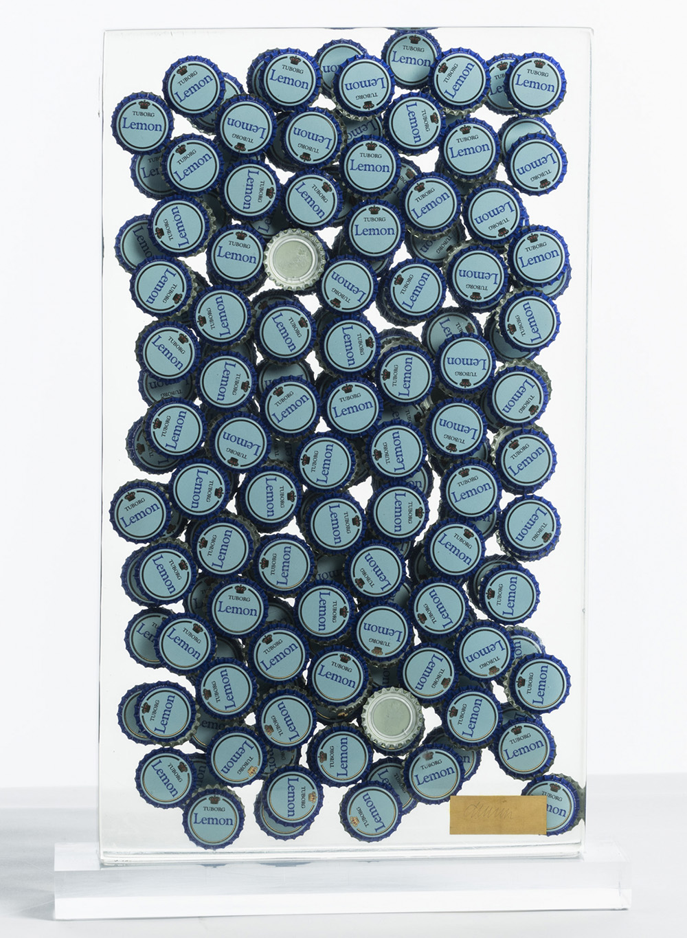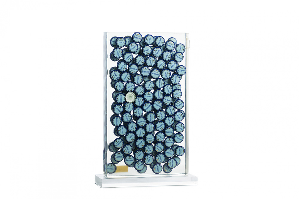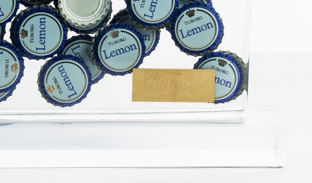 Fernandez Arman 1928 - 2005 Lemon - 1996 tecnica Multiplo inclusione, tappi a corona e plexiglass Dimensioni cm. 42 x 25 x 5 (con base cm. 45 x 29 x 9) Firma Firmato Documenti Certificato di Autenticità a cura di Archives Denyse Durand-Ruel Note Opera n. 1/30 Provenienza Collezione Privata