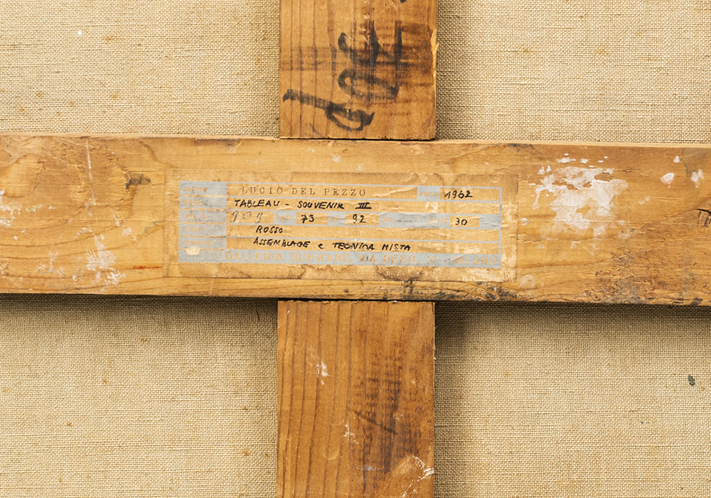 Lucio Del Pezzo 1933 Tavola ricordo III - 1962 tecnica Pittura e assemblaggio di ferro, plastica, setola su tela Dimensioni cm. 91,5 x 72,5 x 12 Firma Firmato e datato in basso al centro Note Etichetta Galleria Schwarz, Milano sul retro Provenienza Collezione Privata Pubblicazioni “Il collezionista d’arte moderna - Annuario della vita artistica italiana nella stagione 1961 - 1962”, Giulio Bolaffi Editore, Torino, 1963, p. 75 Esposizioni “Lucio del Pezzo”, Galleria Schwarz, Milano, 1 - 15 giugno 1962