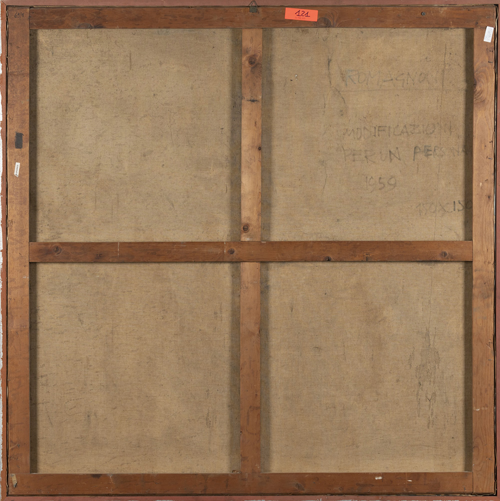 Bepi Romagnoni 1930 - 1964 Modificazioni per un personaggio - 1959 tecnica Olio su tela Dimensioni cm. 150 x 150 Firma Firmato e datato in basso a destra Provenienza Collezione Privata