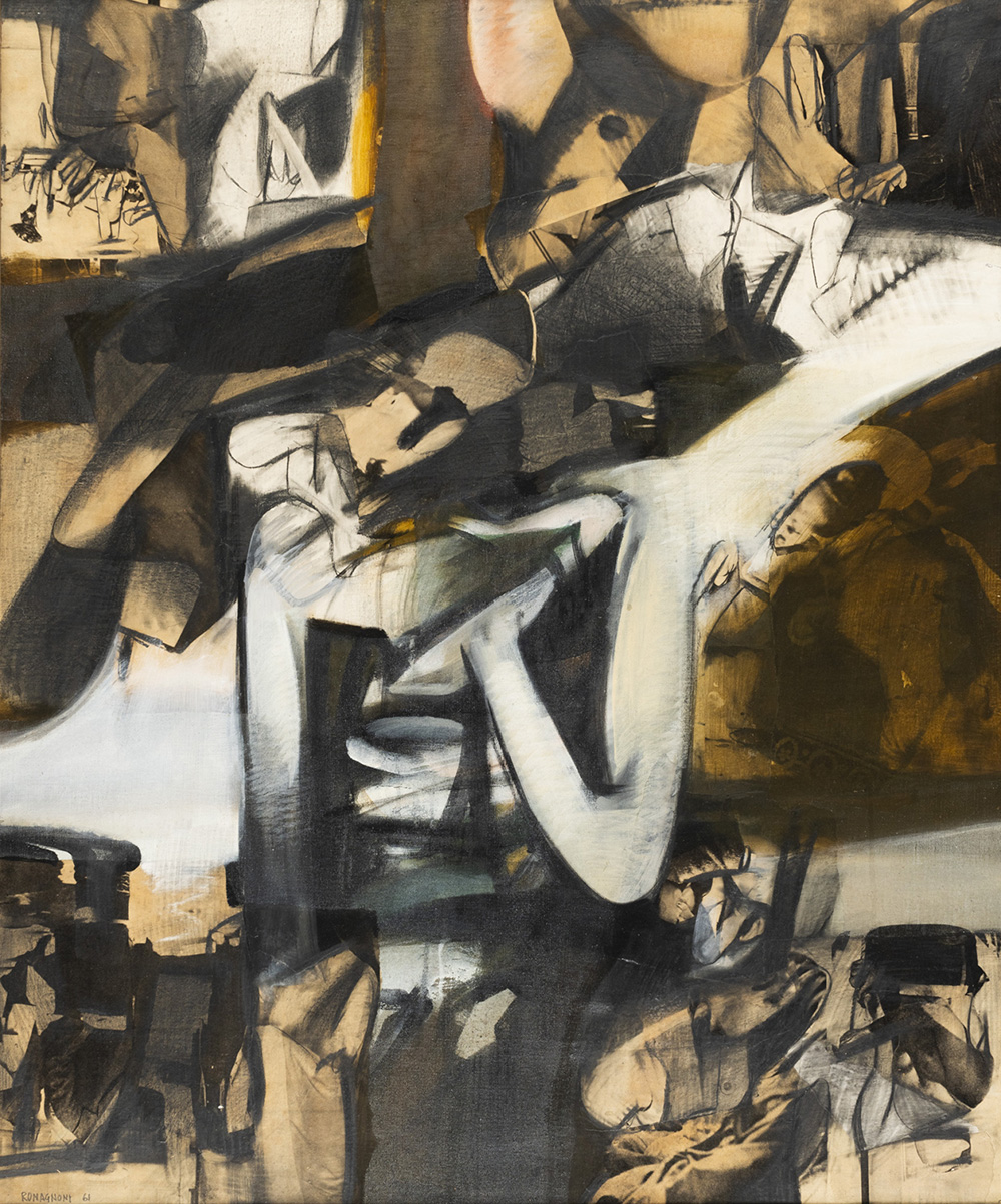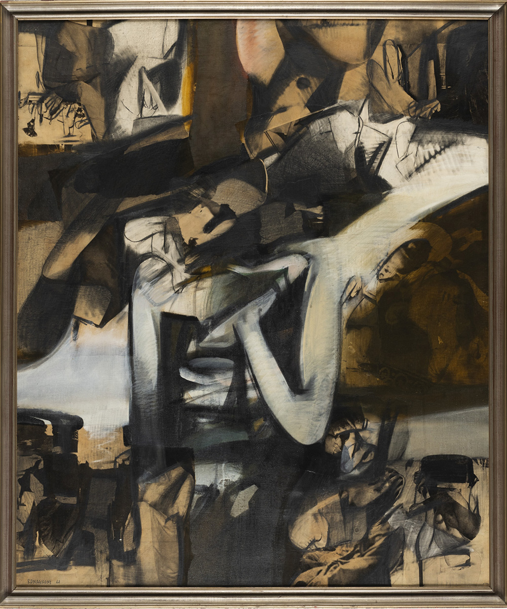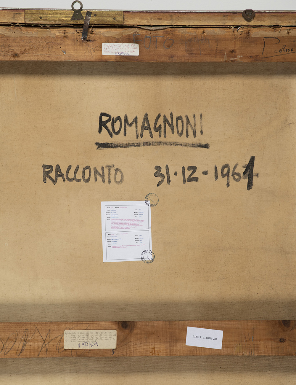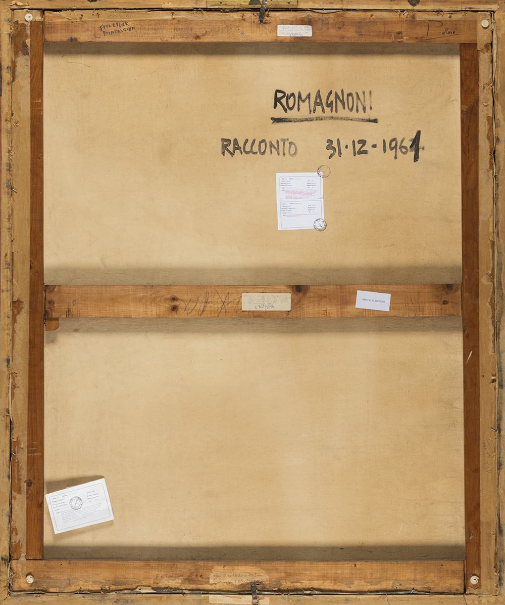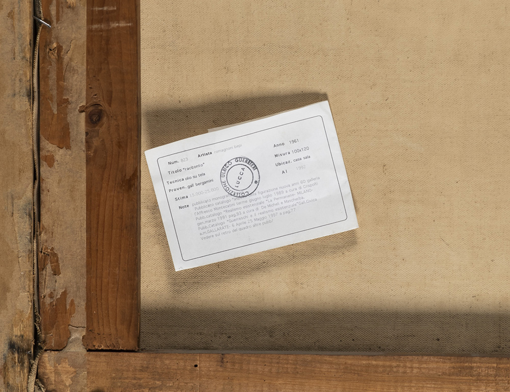 Bepi Romagnoni 1930 - 1964 Racconto - 1961 tecnica Tecnica mista e collage su tela Dimensioni cm. 100 x 120 Firma Firmato e datato in basso a sinistra Note Timbro Collezione Ulrico Guerrieri, Lucca sul retro Provenienza Galleria Bergamini, Milano Collezione Ulrico Guerrieri, Lucca Collezione Privata Pubblicazioni “Bepi Romagnoni. Un giovane maestro della pittura contemporanea”, Bruno Alfieri Editore, Milano, 1966, tav. n.22 “Aspetti della Figurazione Nuova. Anni ’60”,a cura di Enrico Crispolti, catalogo mostra Galleria l’Affresco, Montecatini, 1989 “Realismo Esistenziale”, catalogo mostra Palazzo della Permanente, Milano (22 gennaio - 3 marzo 1991), Mazzotta Editore, 1991, p. 93 “Guerreschi e il Realismo Esistenziale. Gli anni Cinquanta/Sessanta a Milano”, catalogo mostra Civica Galleria d’Arte Moderna di Gallarate, Cesena (6 aprile - 25 maggio 1997), Il Vicolo - Divisione Libri, p. 77